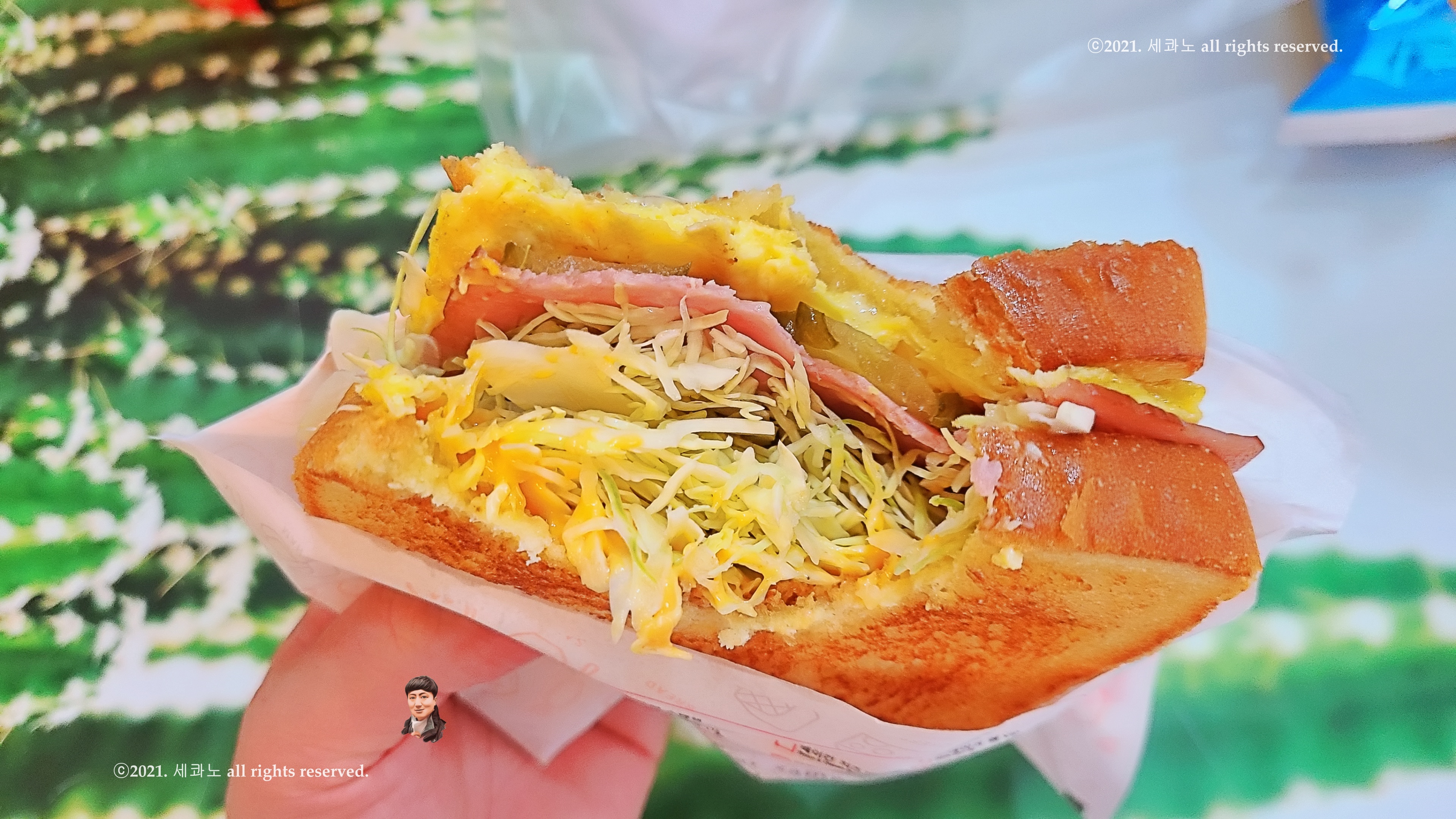 햄 치즈 토스트에 신선한 양배추를 추가한