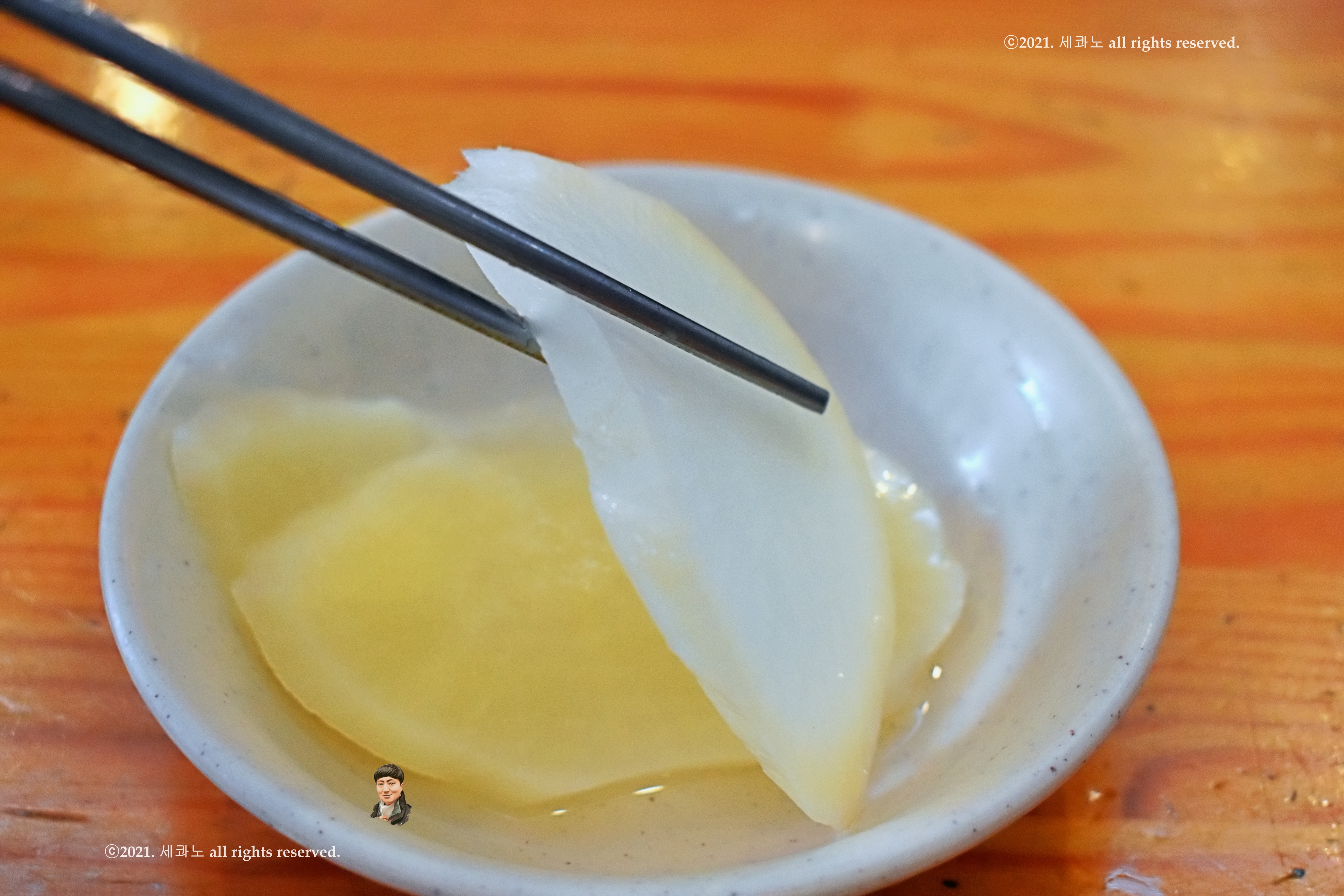 기다리는 사이에 백단무지 섞박지처럼 투박하게 썰어낸 찬이 나왔고