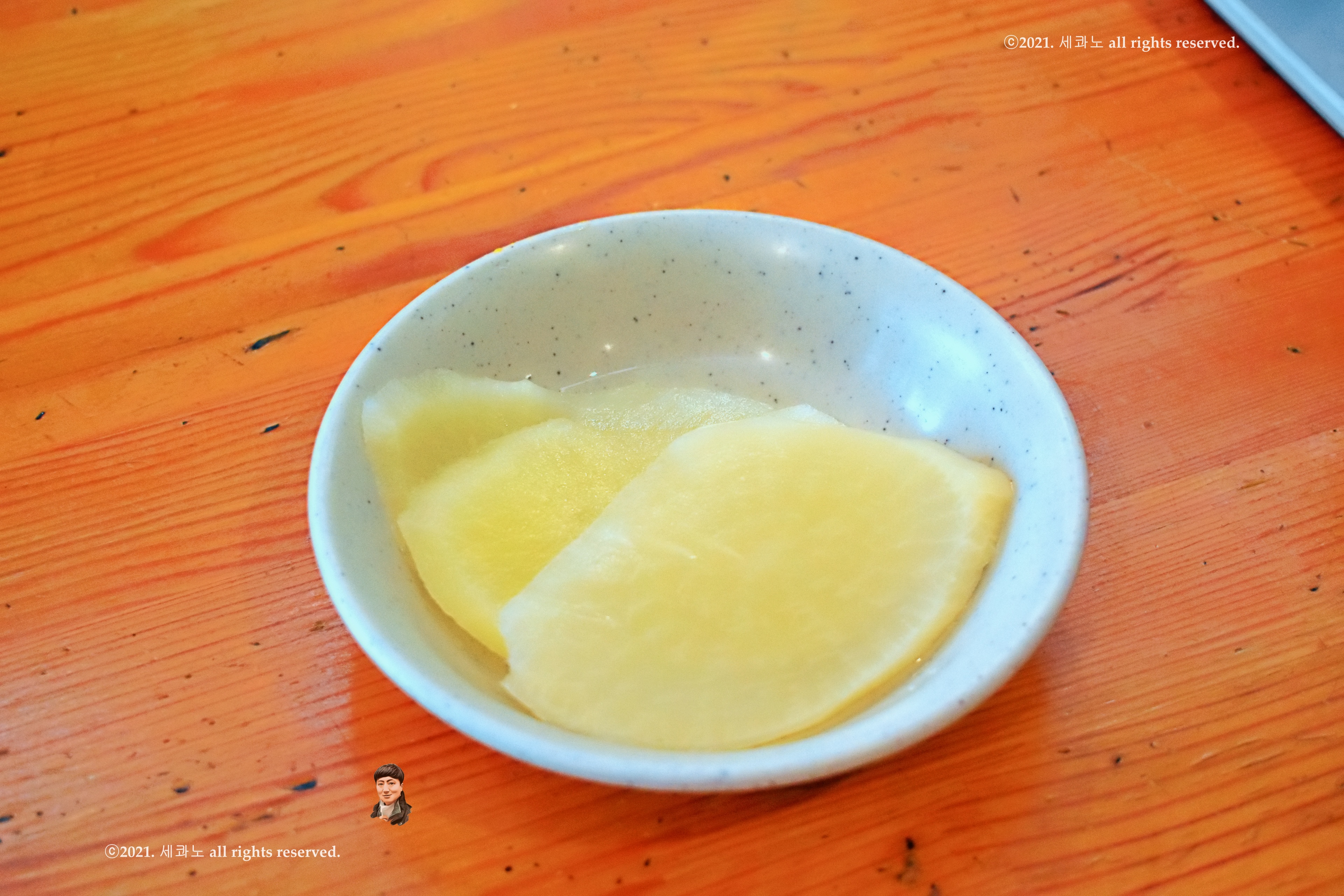 기다리는 사이에 백단무지 섞박지처럼 투박하게 썰어낸 찬이 나왔고