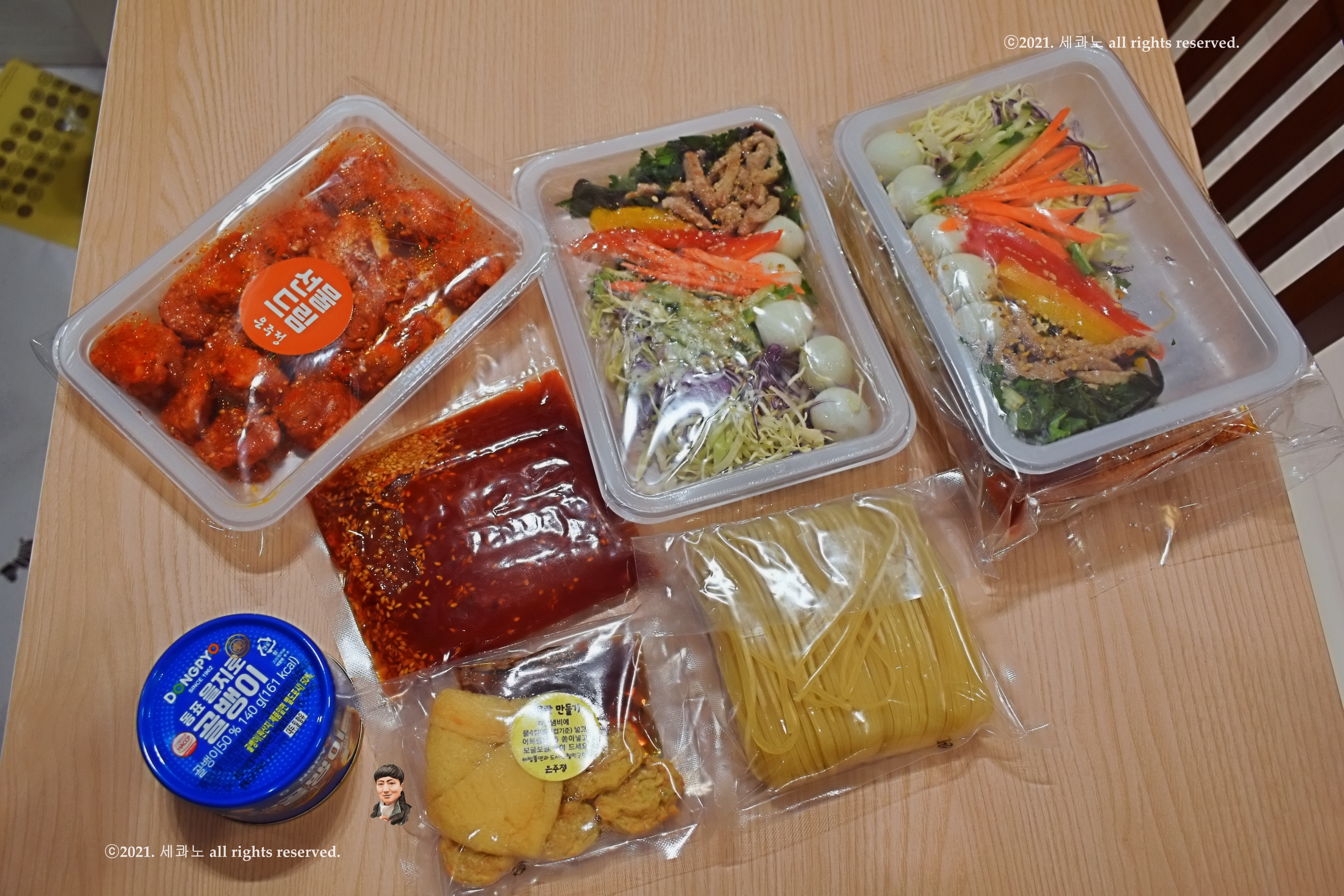 쫄면, 어묵탕 재료, 비빔양념장이 한 봉투에 담겨 있었다.