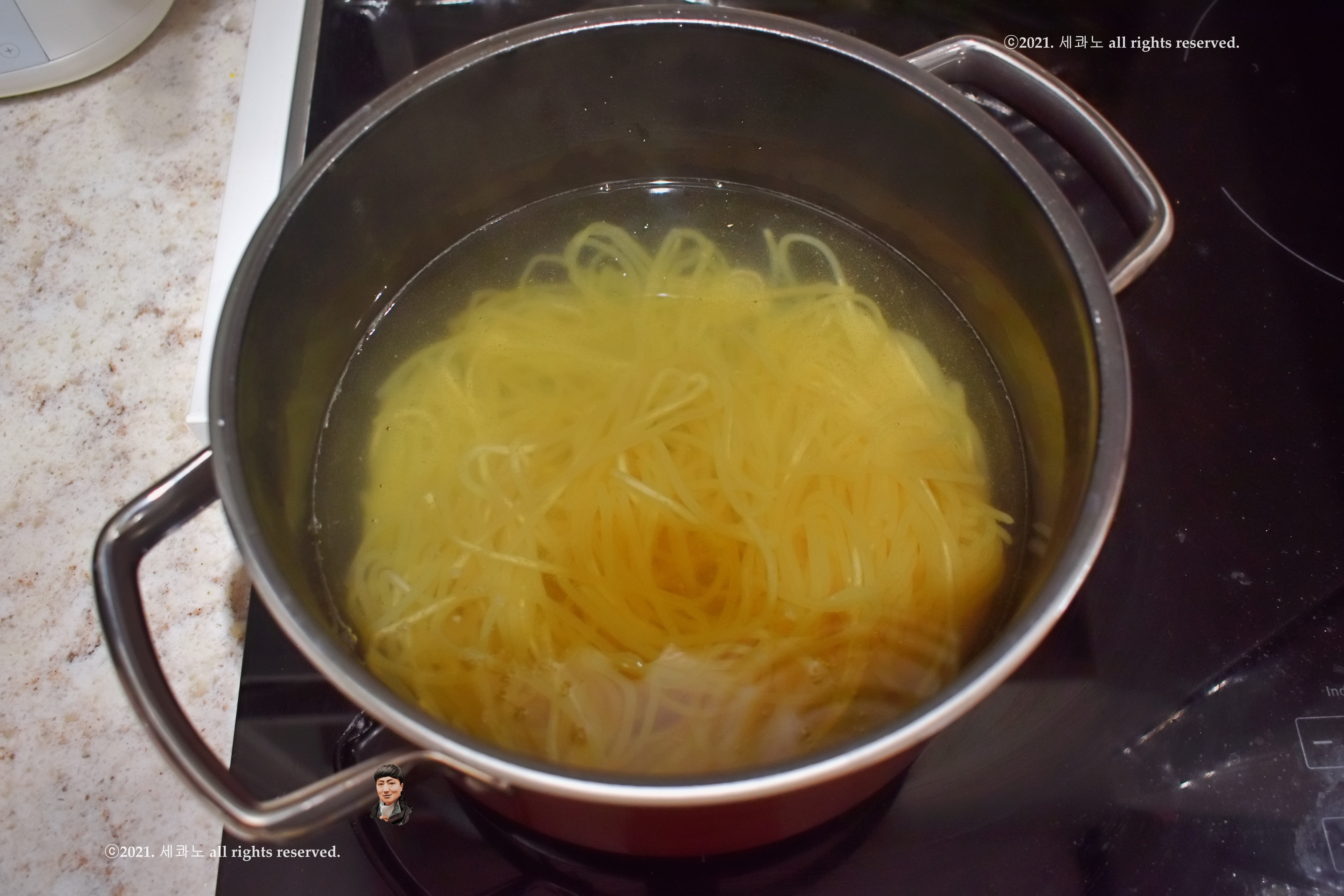 1. 끓는 물에 면을 3분가량 삶아 줍니다. ※ 젓가락으로 뒤적뒤적해주세요!