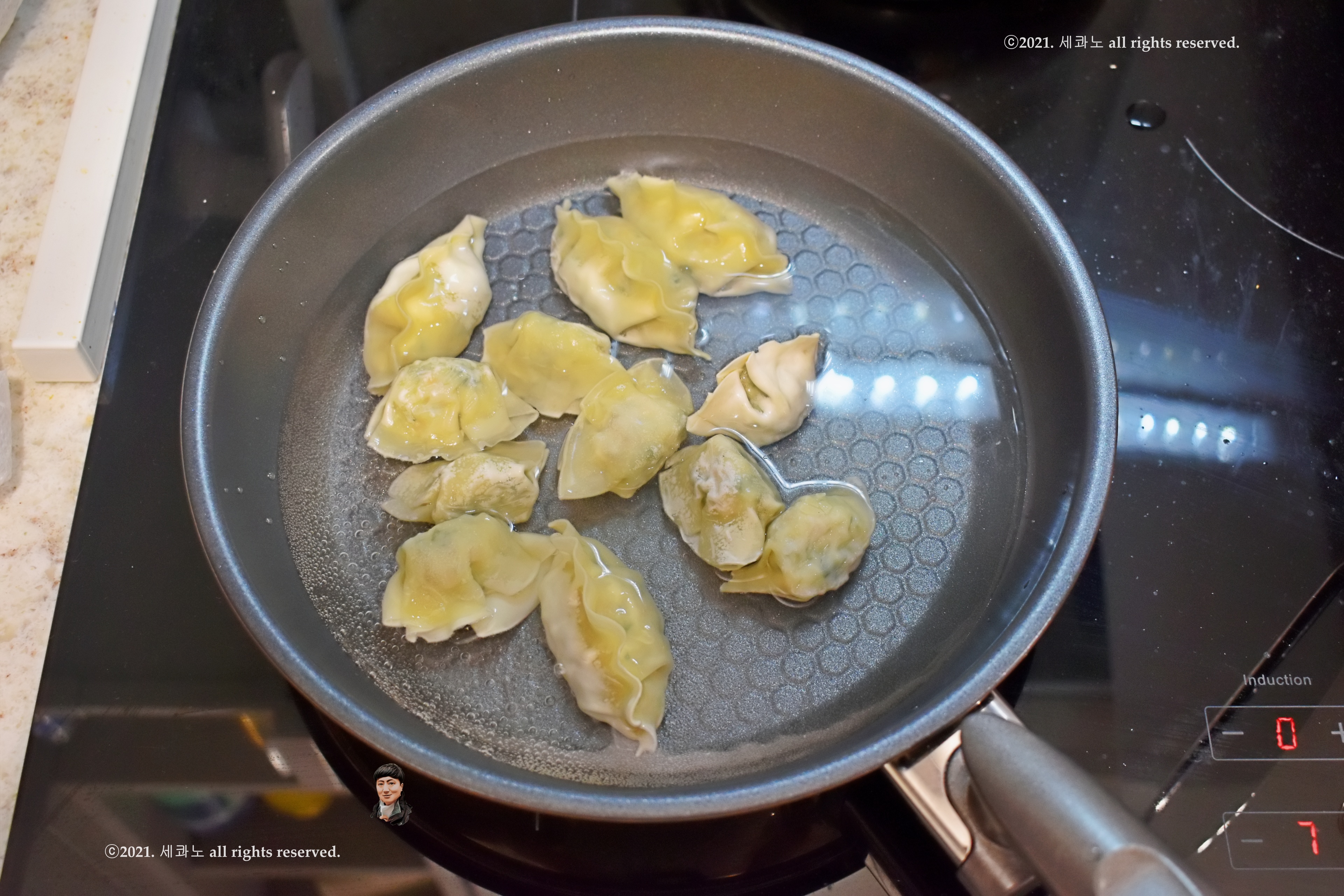 물만두와 교자 만두를 팬에 삶아주고