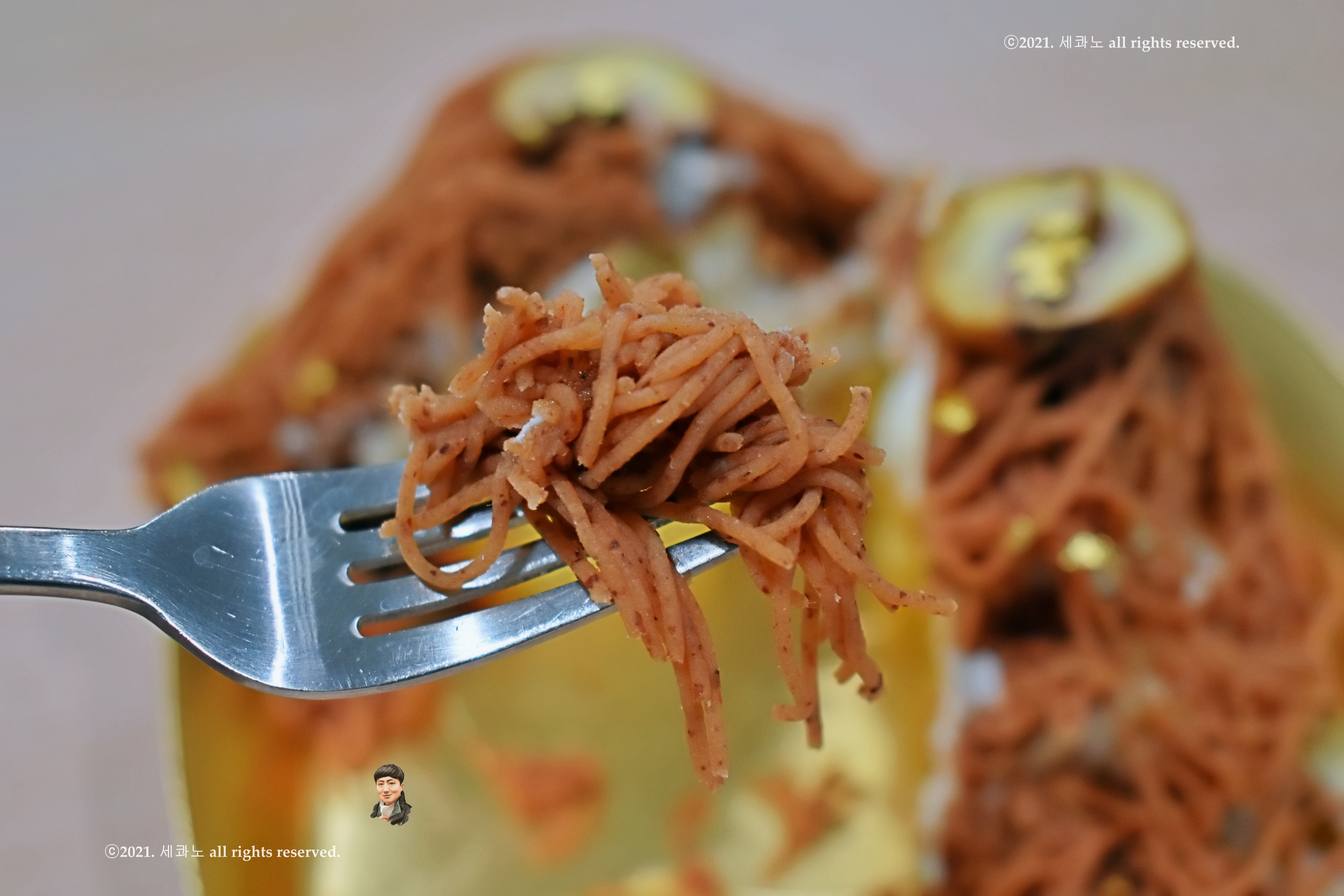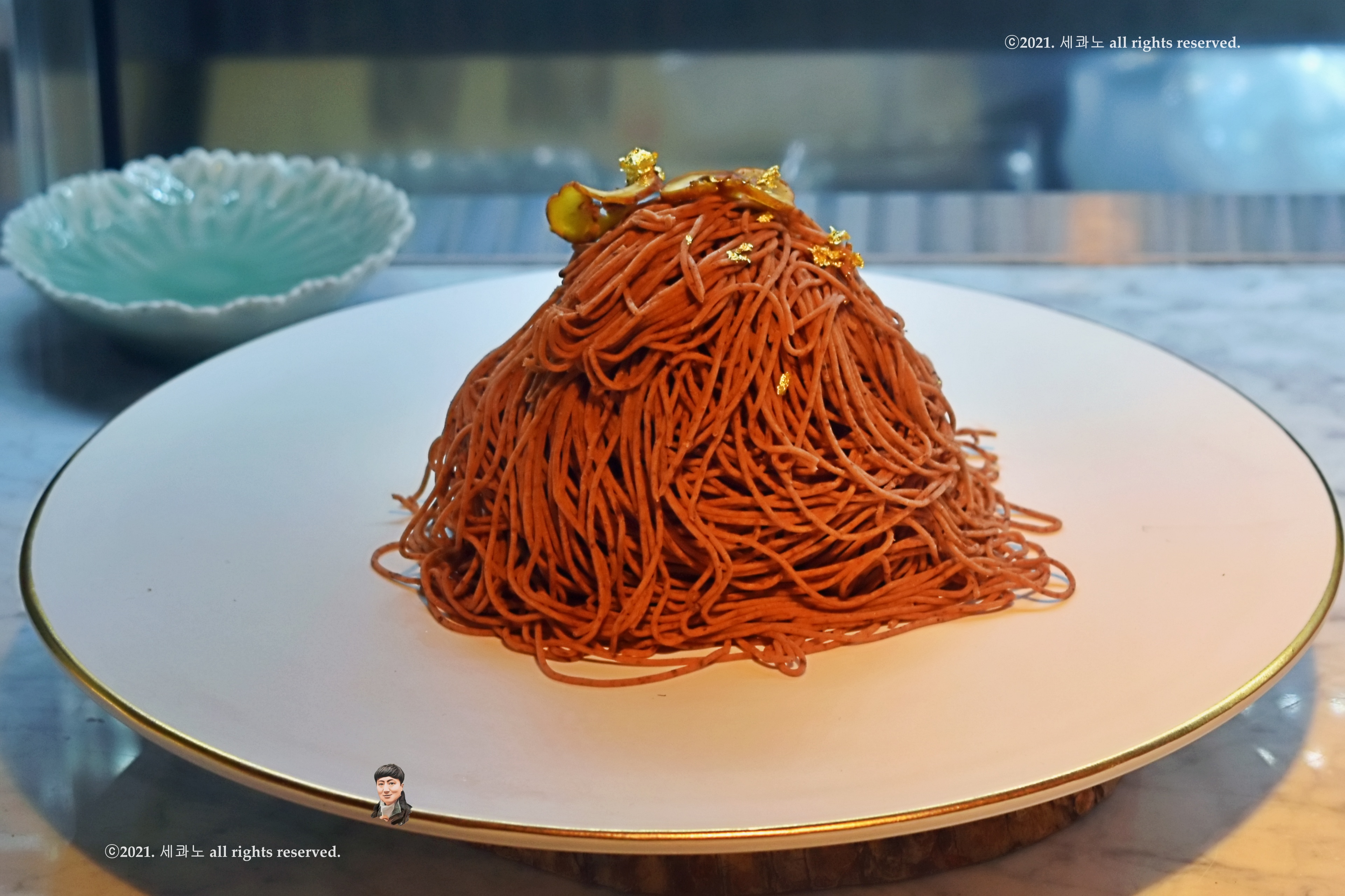 메밀국수가 덮여있는 듯한 독특한 비주얼의 타래 케이크다.