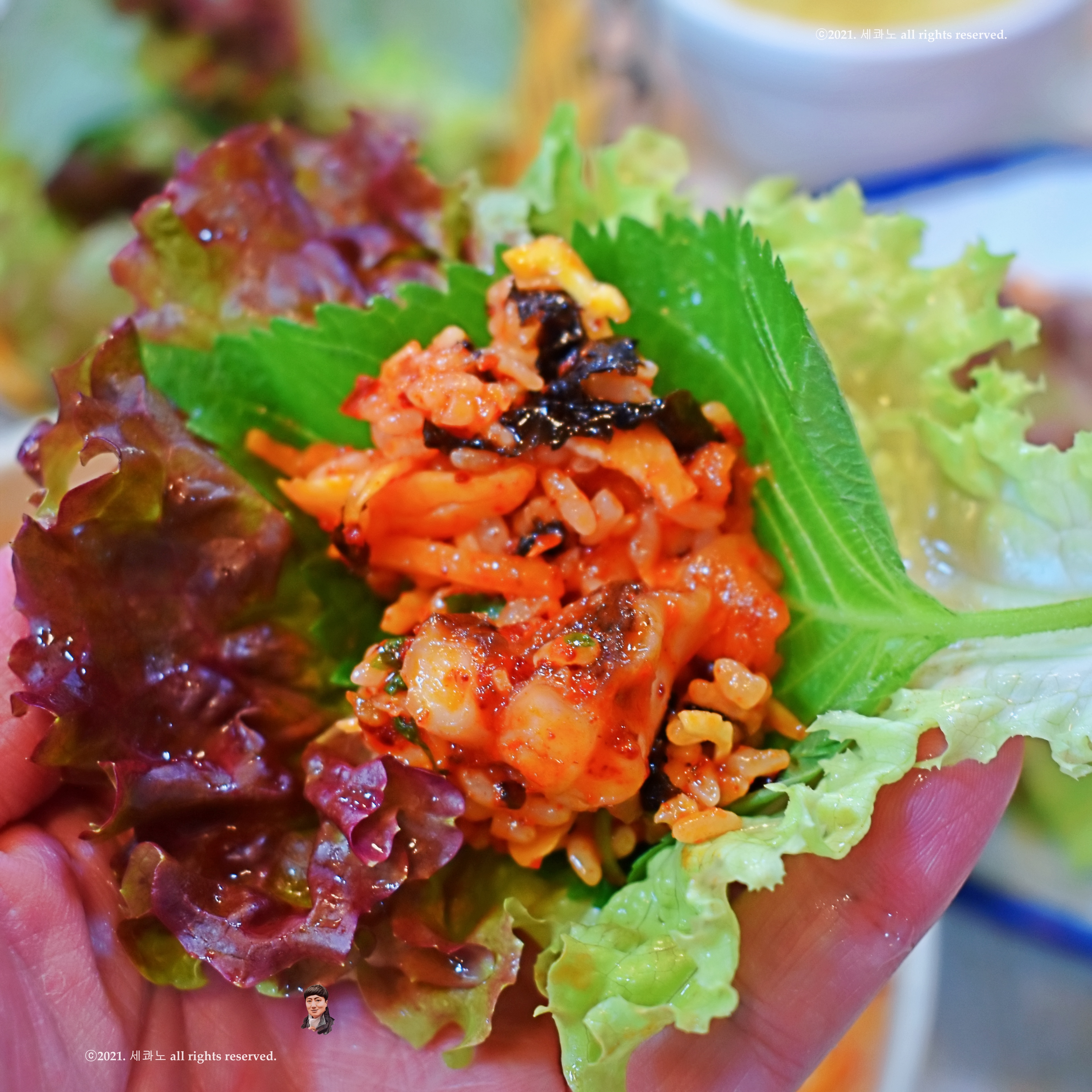 무침회 비빔밥을 쌈에 싸 먹어도 맛있다.