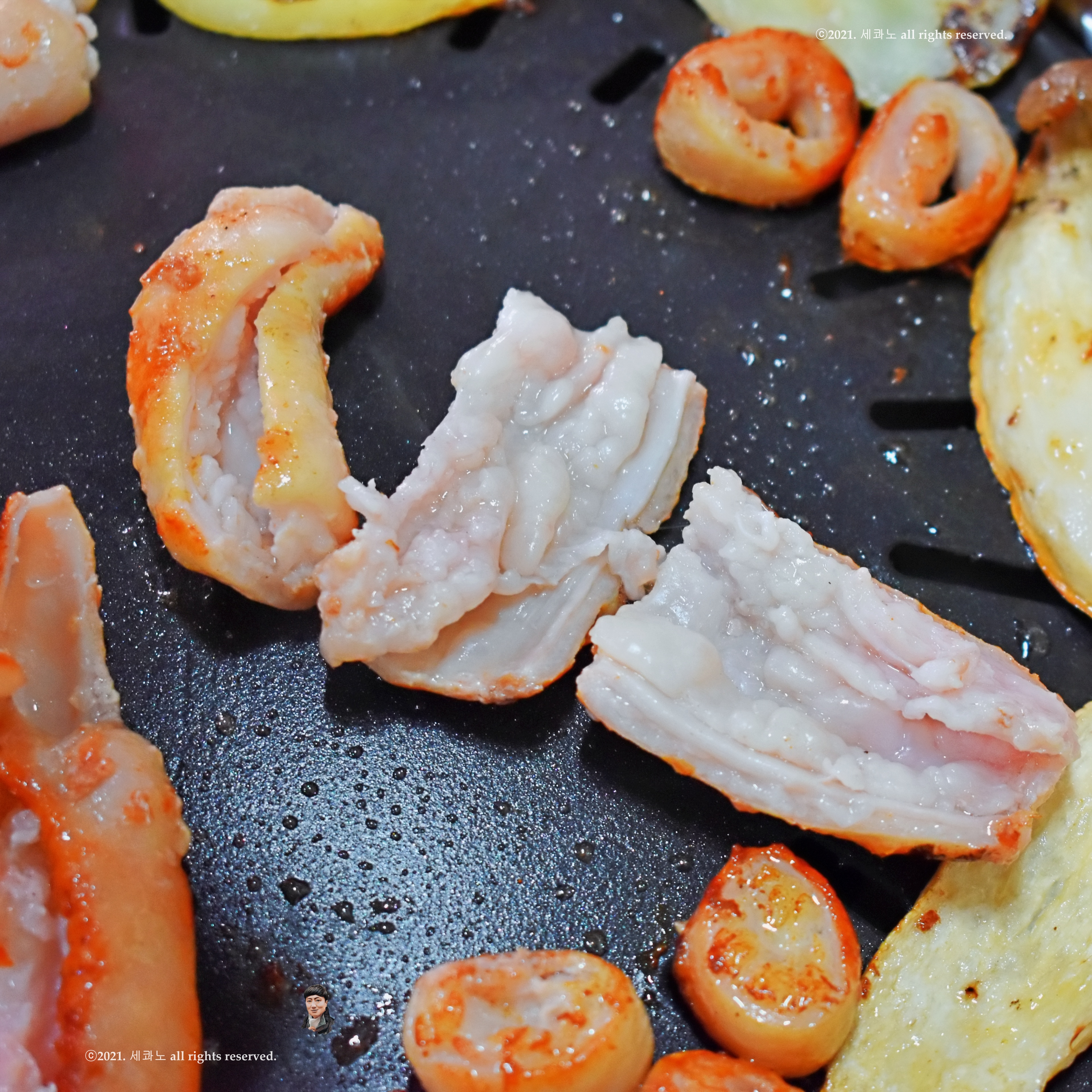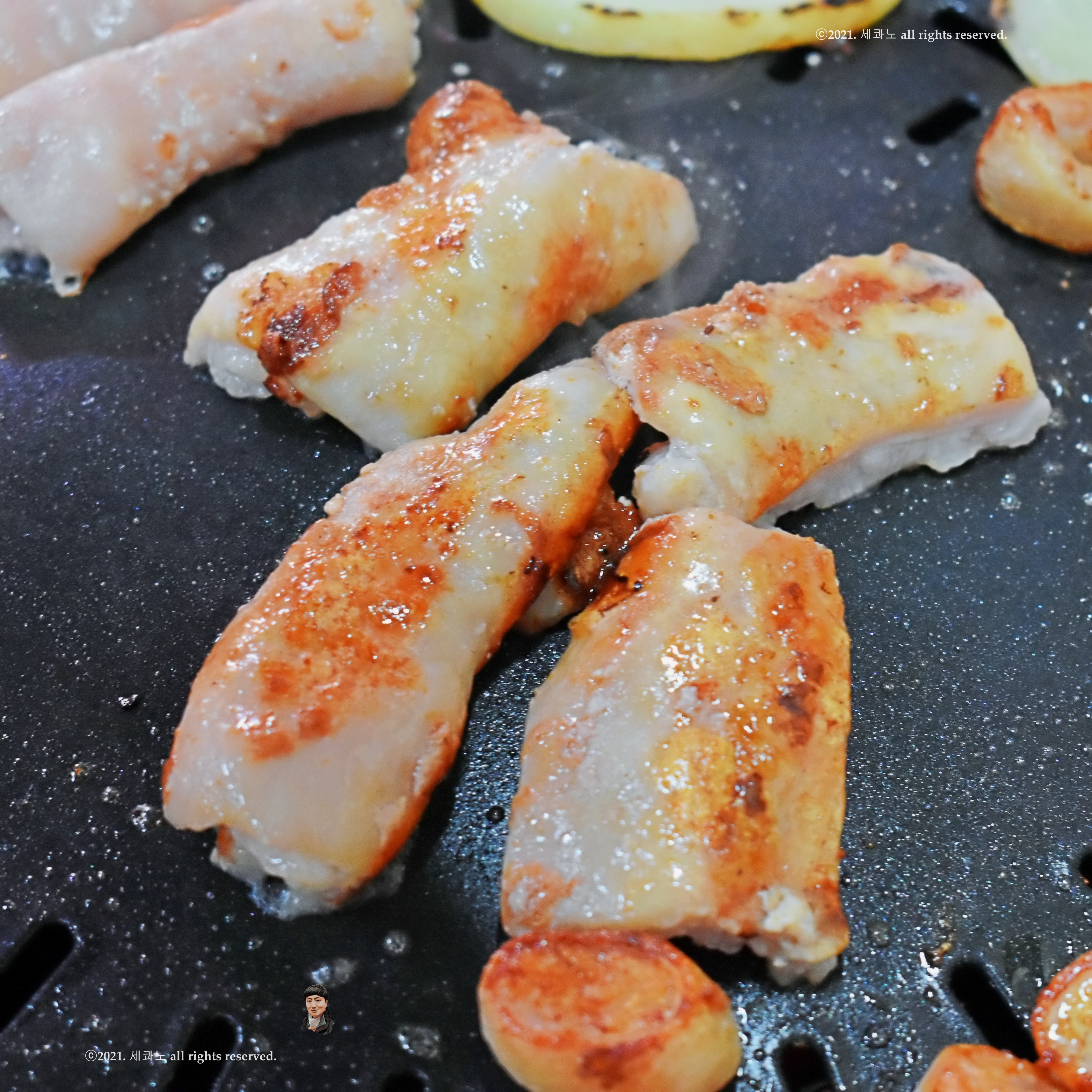 특히 안쪽 지방 부분이 아래로 가도록 해서 구워주면