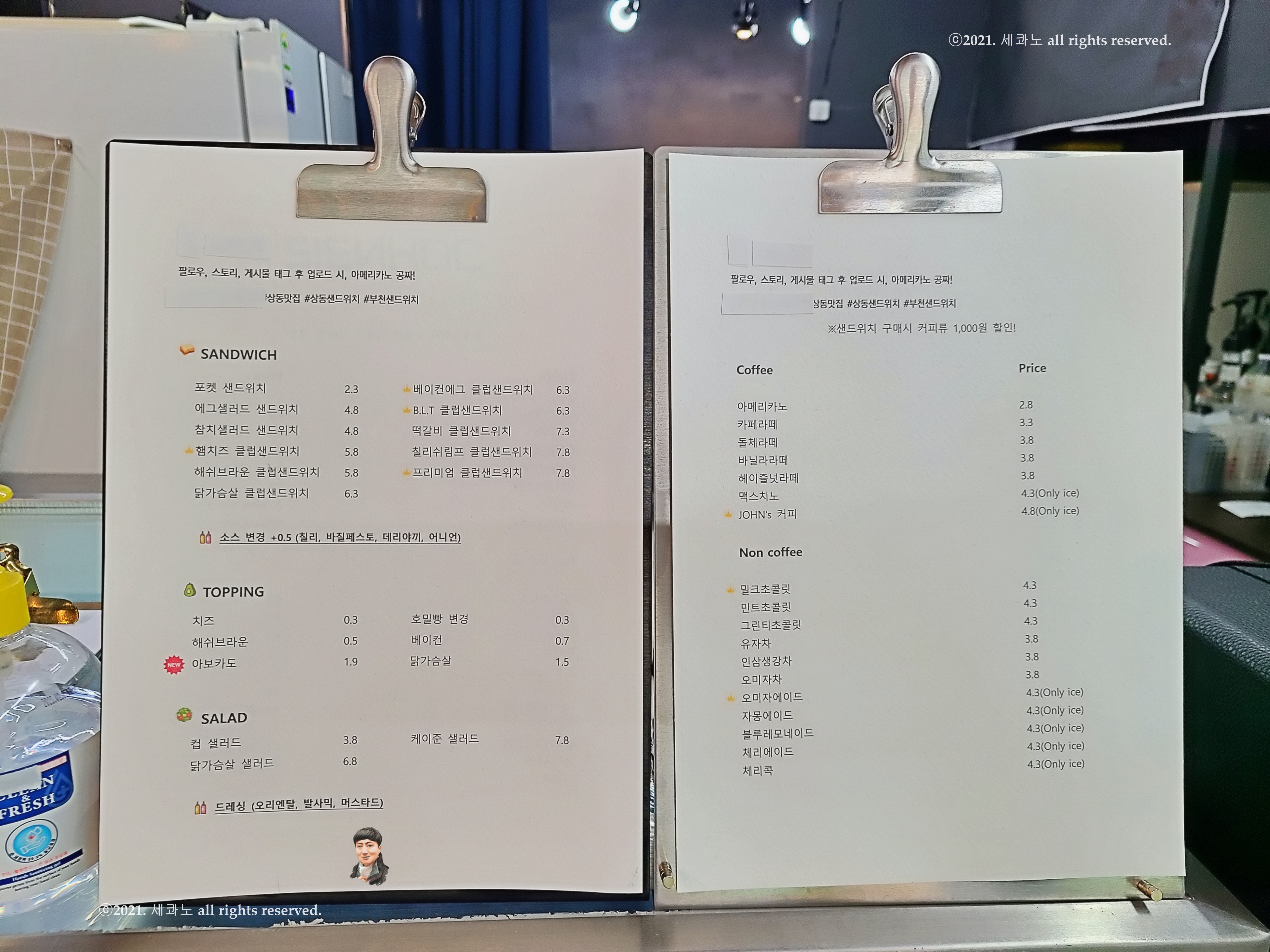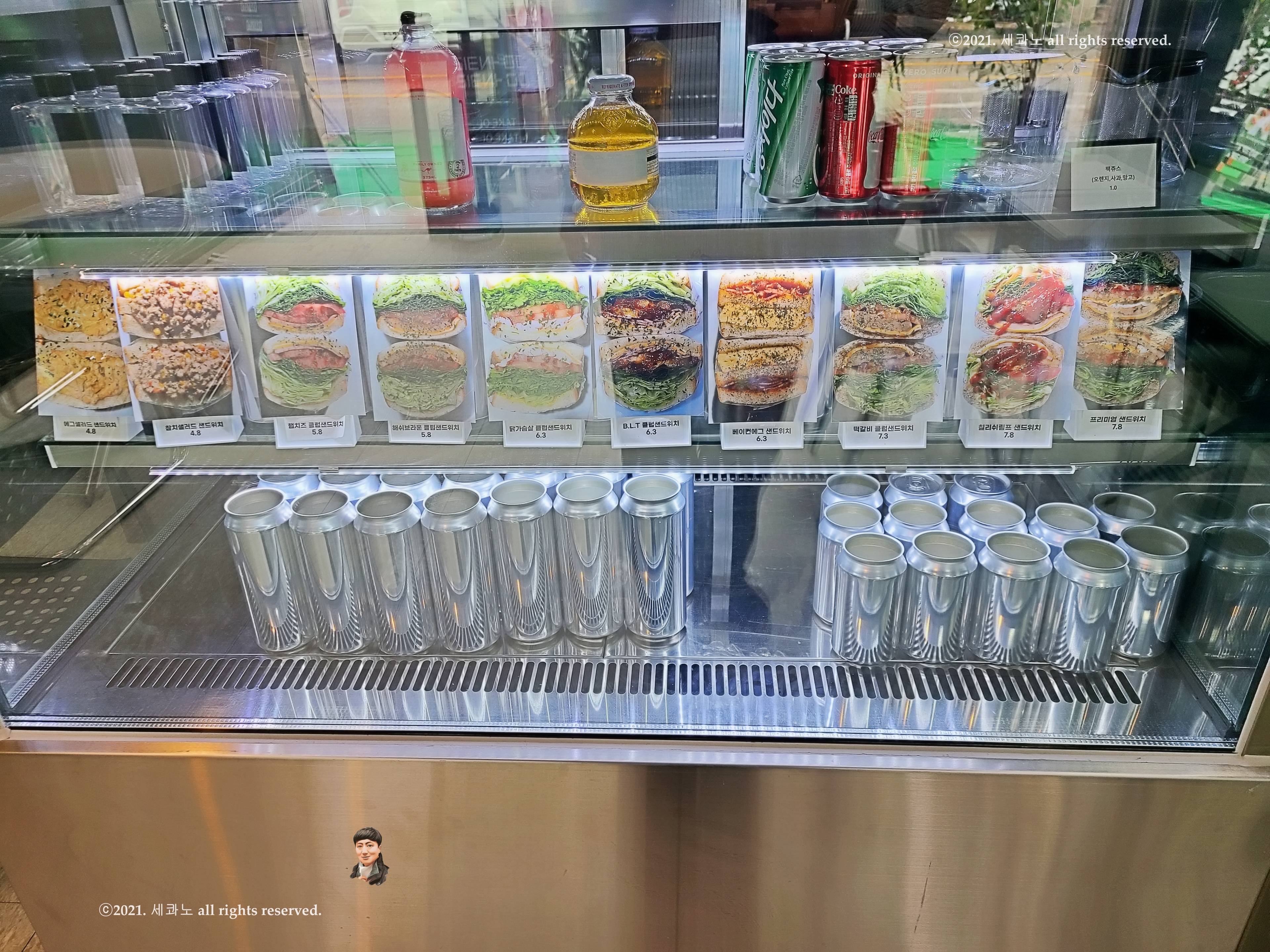 진열장에 샌드위치 사진을 전시해 두었다.