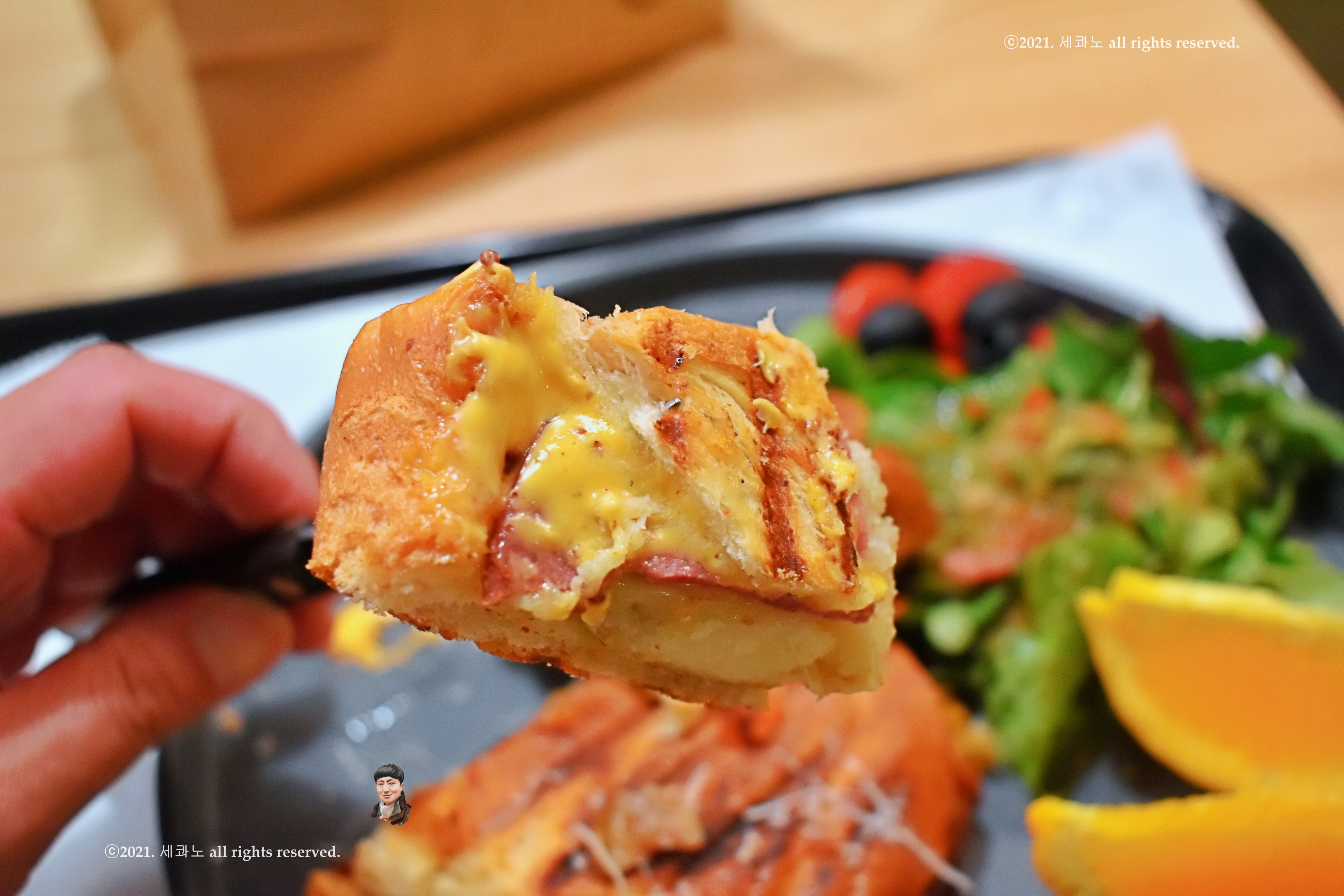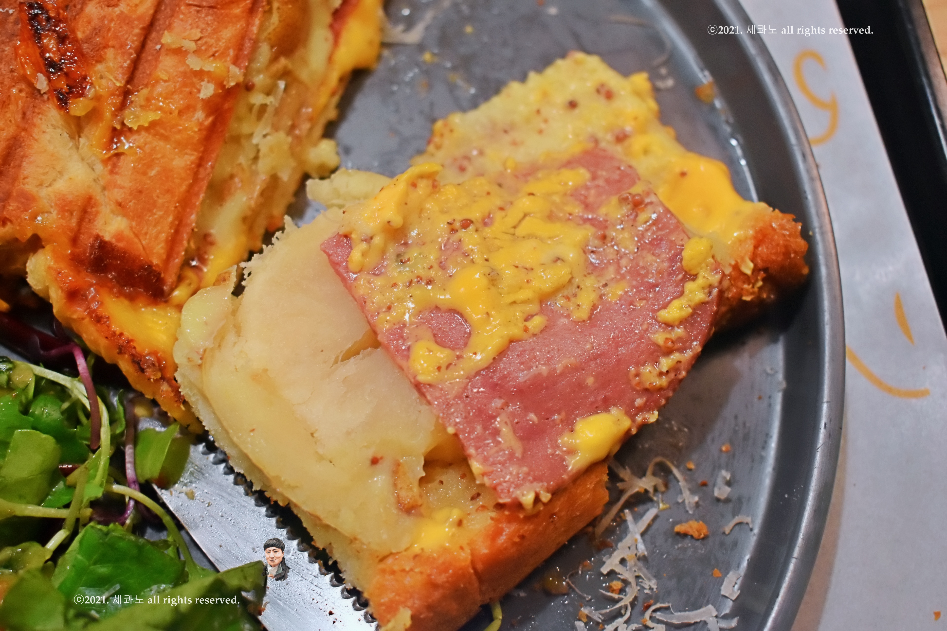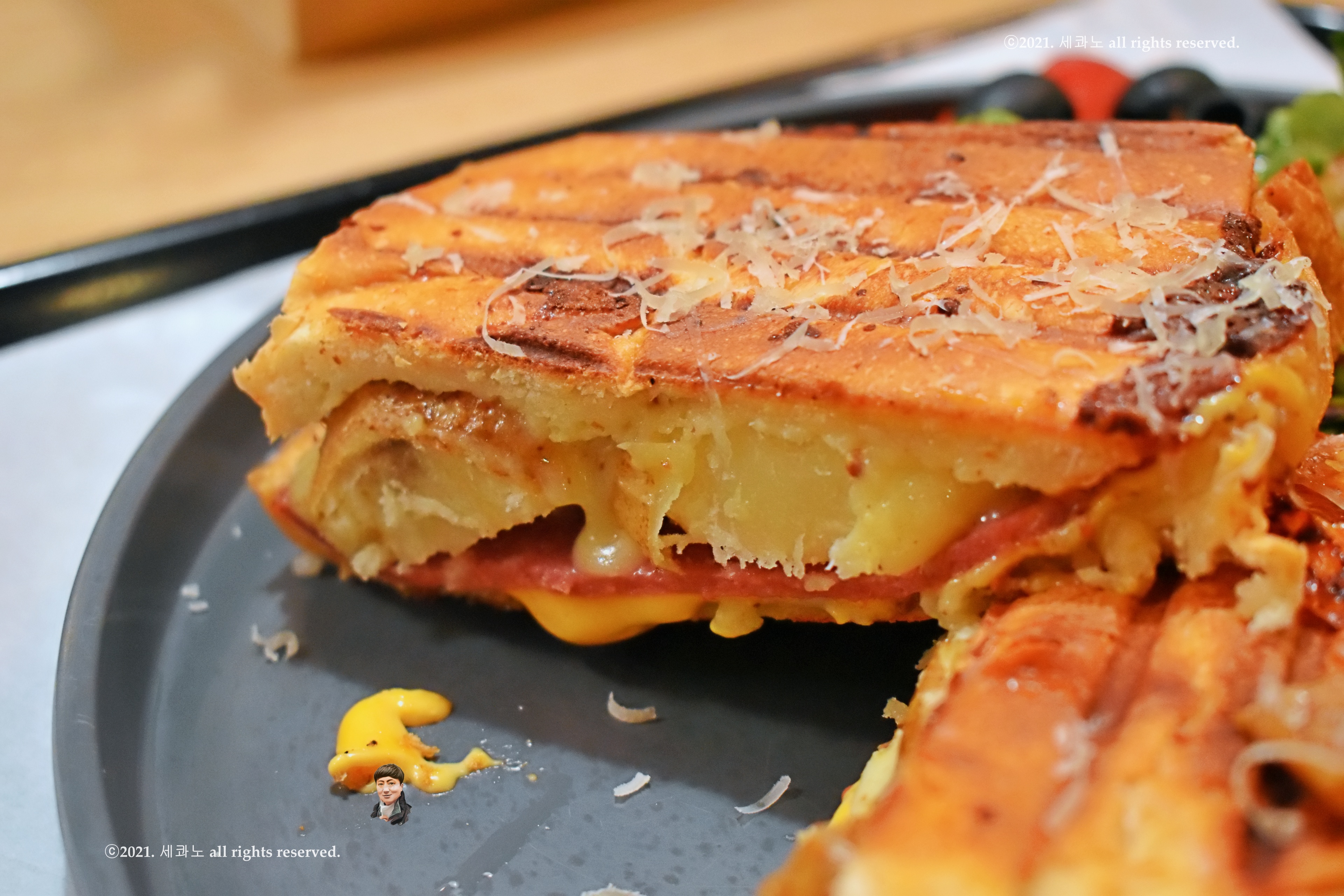 파니니 빵 안쪽에 감자와 살라미.. 홀그레인 머스타드?