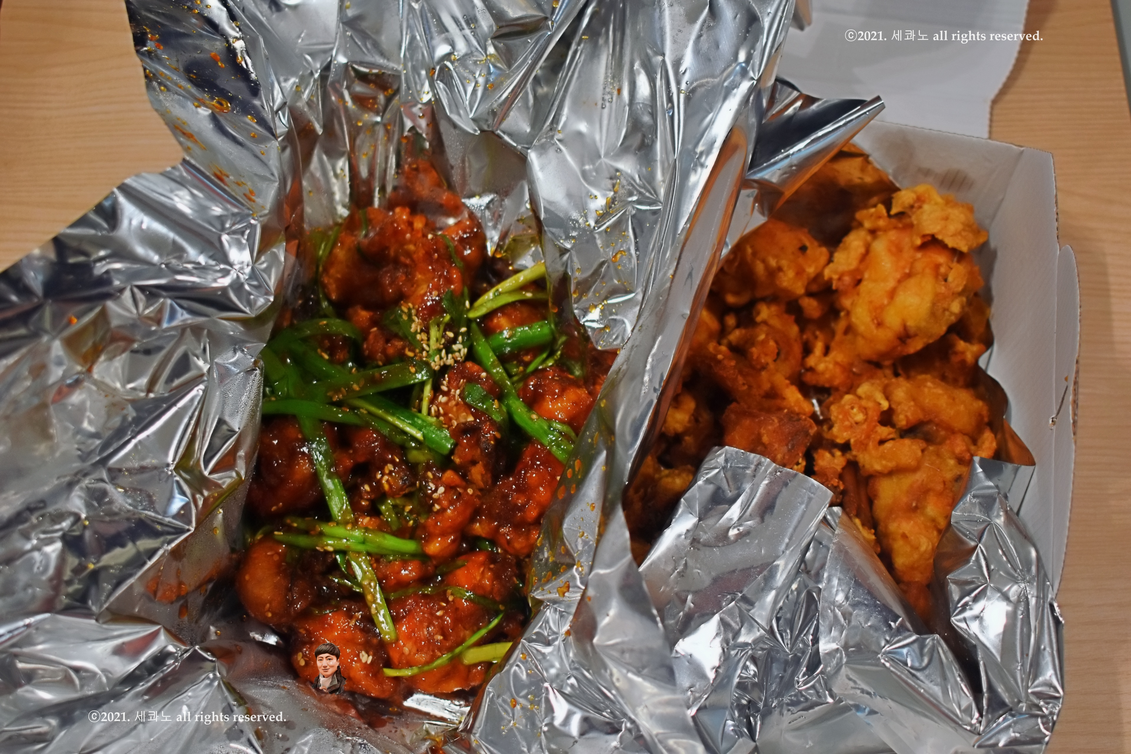 역시 후라이드도 먹어봐야 하지 않겠어 하면서 반반 주문하였다.