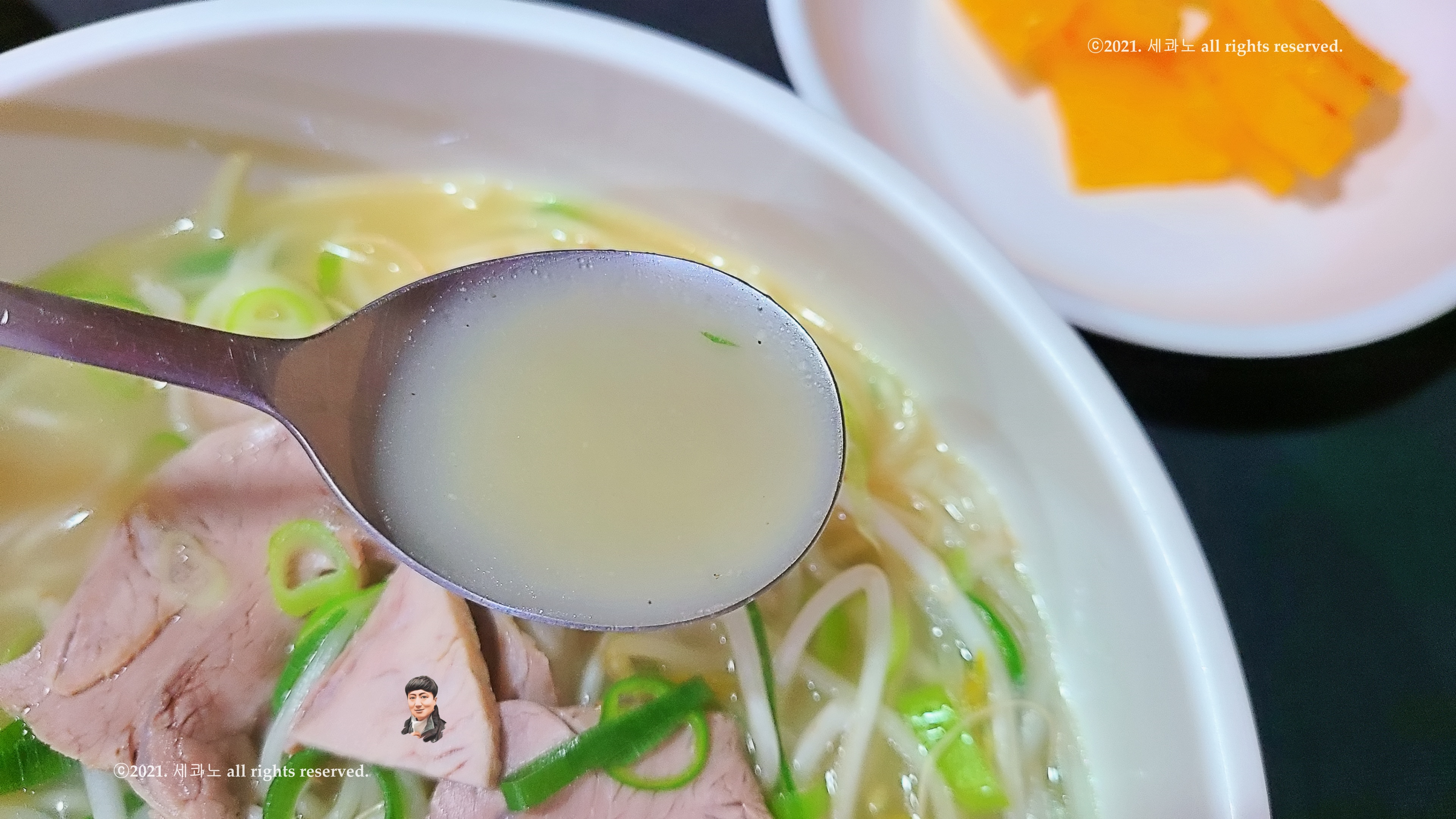 소 사골, 돼지고기(사태, 삼겹살) 등을 사용해 육수를 내는 듯싶다.
