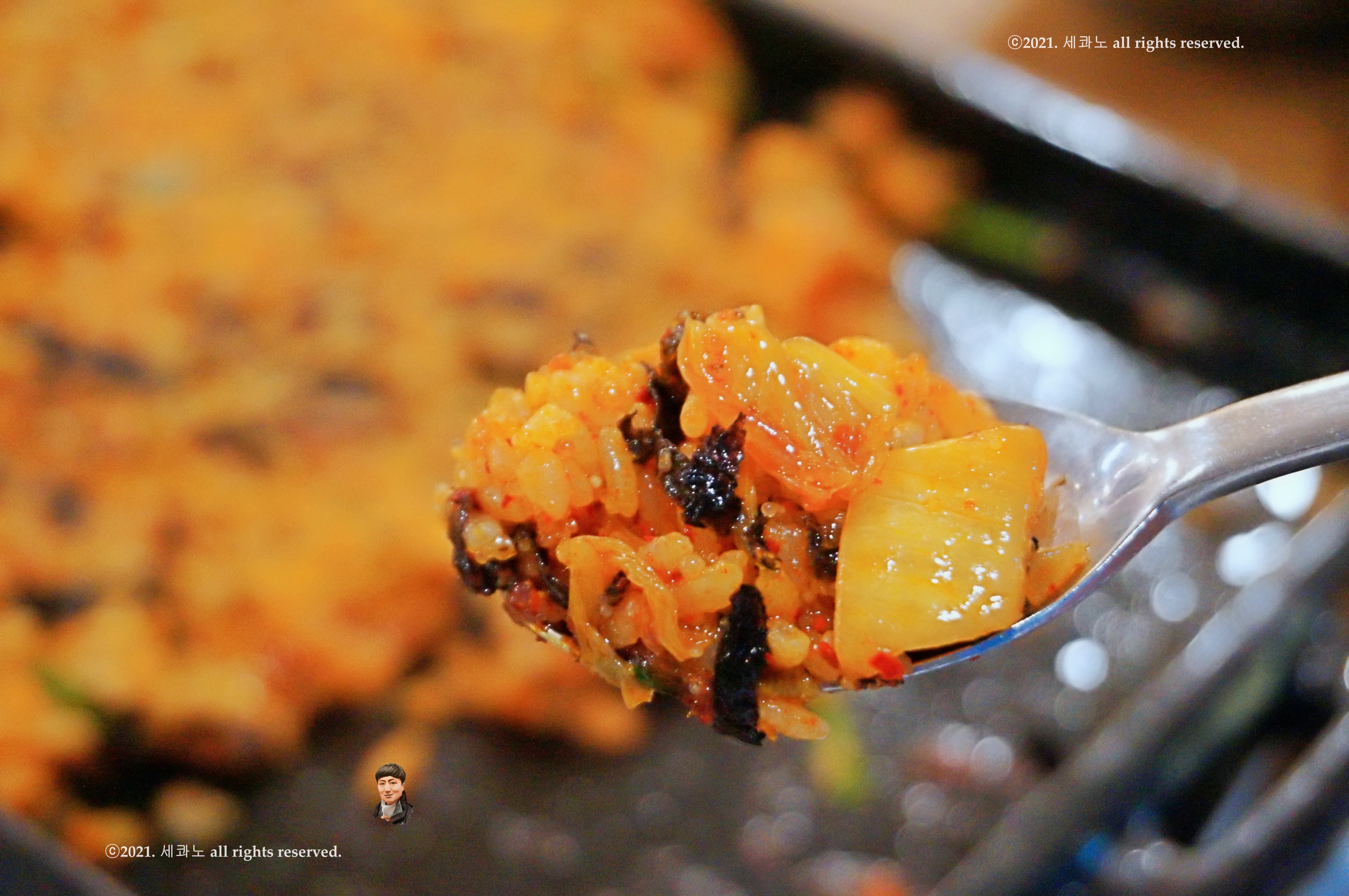 그 위에 날치알과 김가루 뿌려서 잘 볶아준 다음