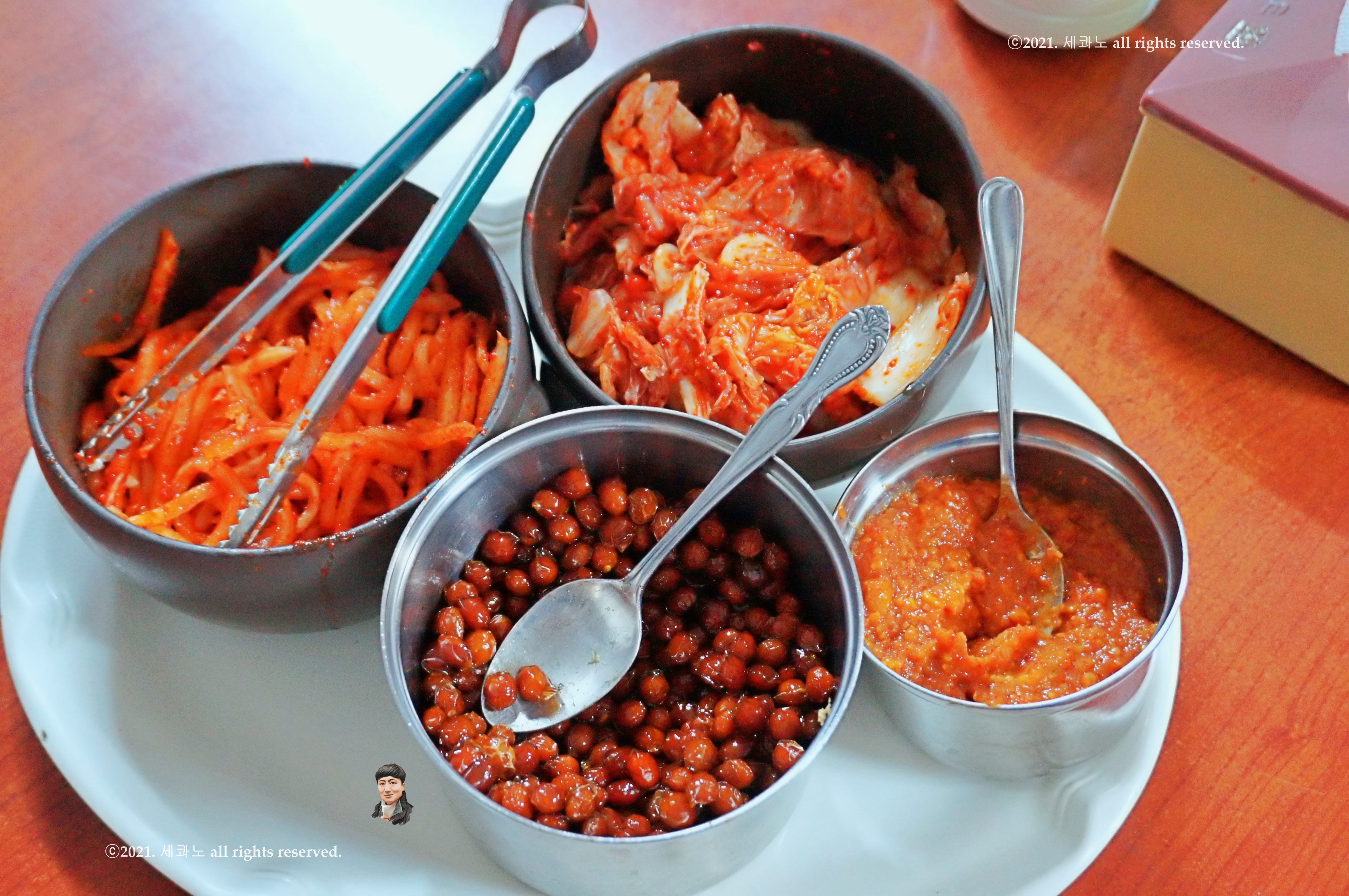 무채, 김치, 콩자반, 반찬통이 나와서 적당량 앞 접시에 덜어 먹으면 되고