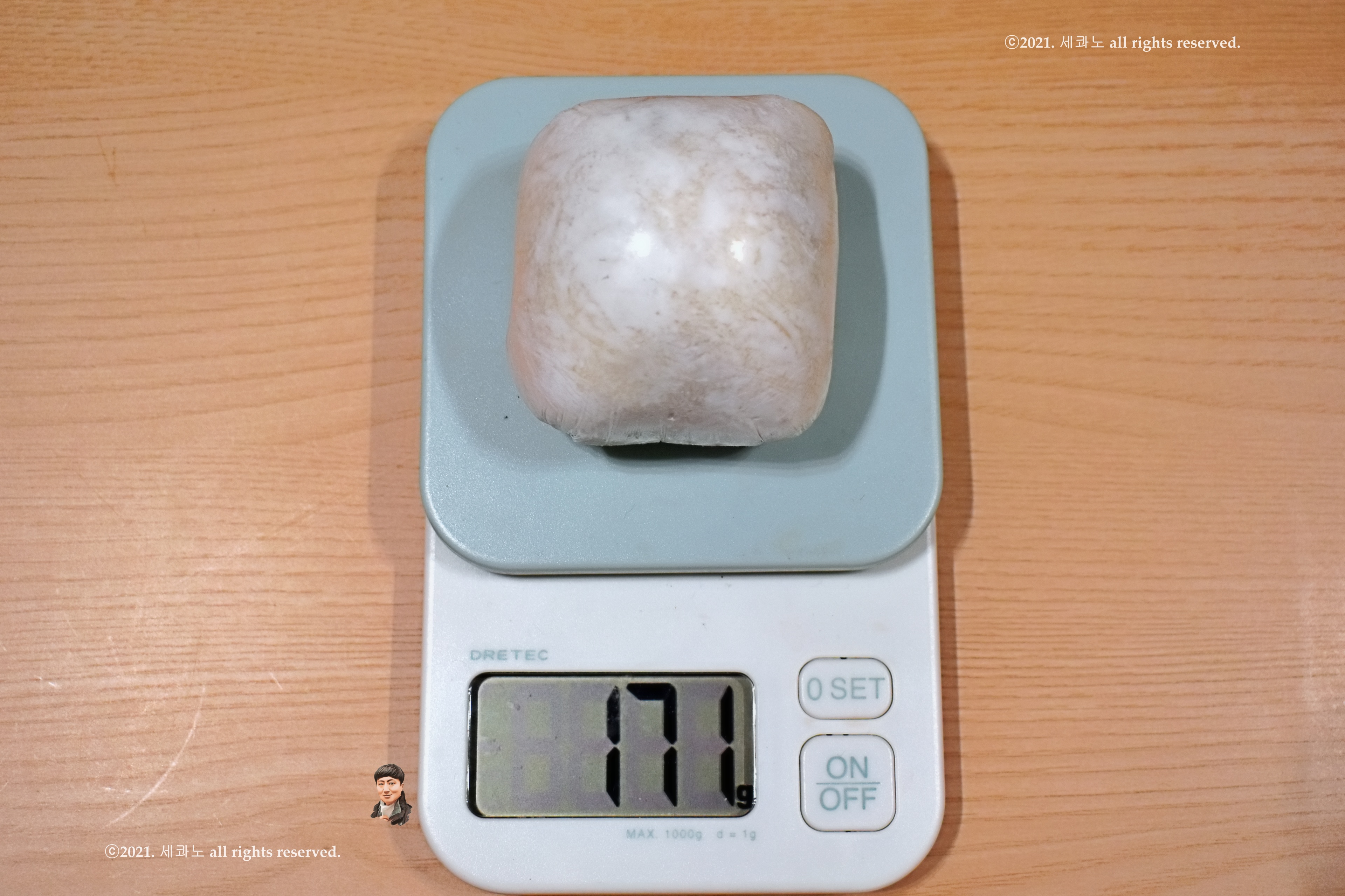 저울을 꺼내 냉동되어 있는 떡의 무게를 재어보았다.