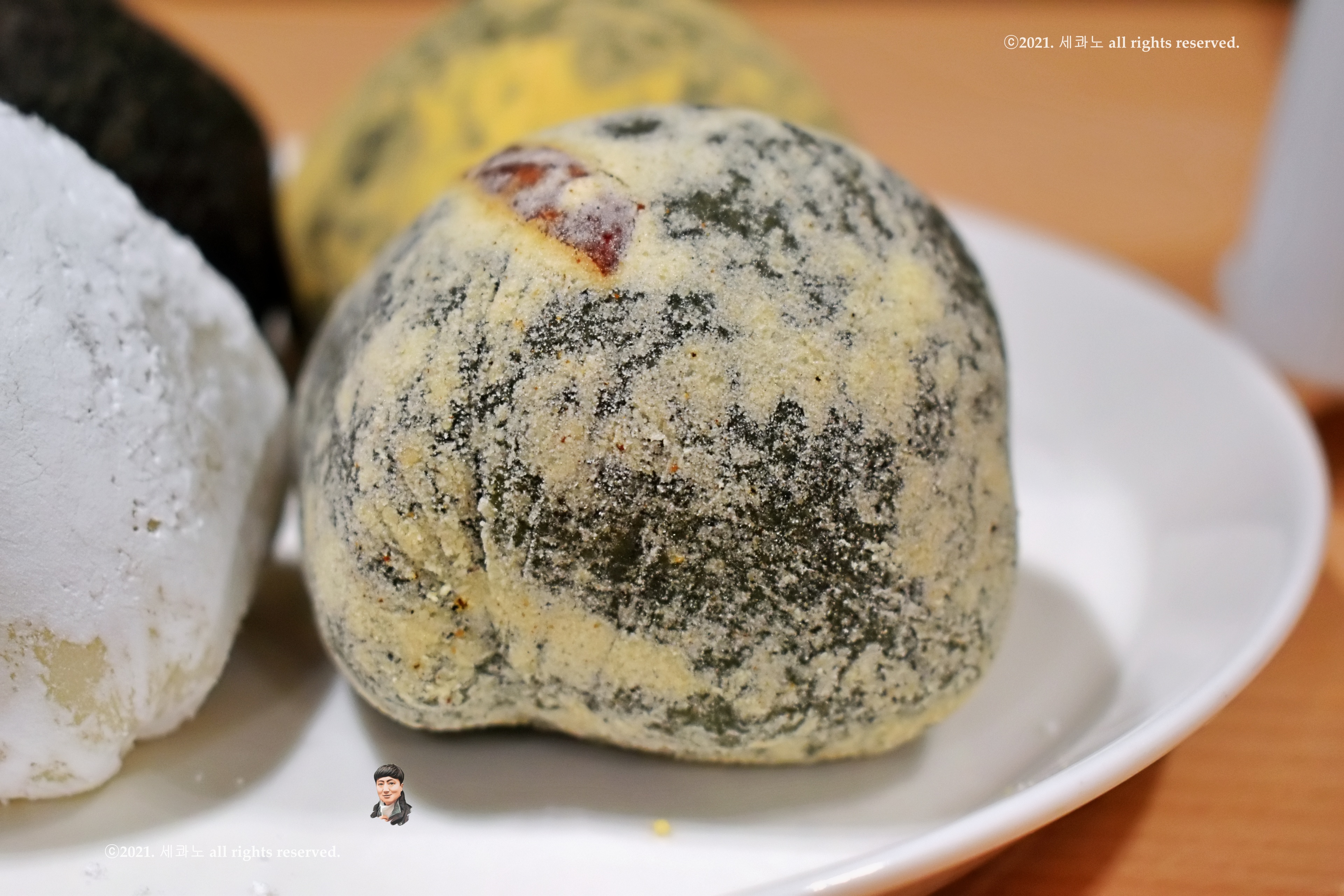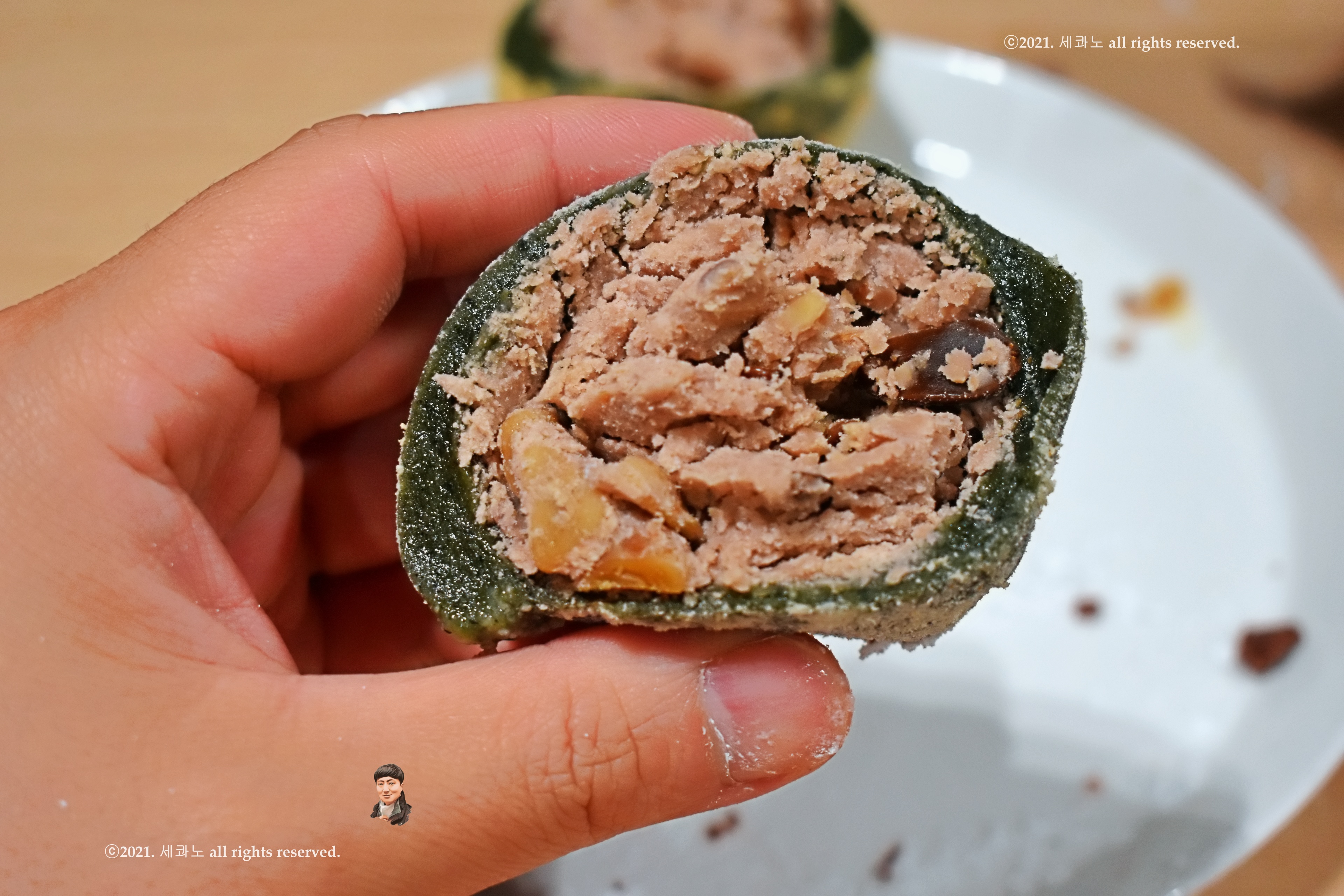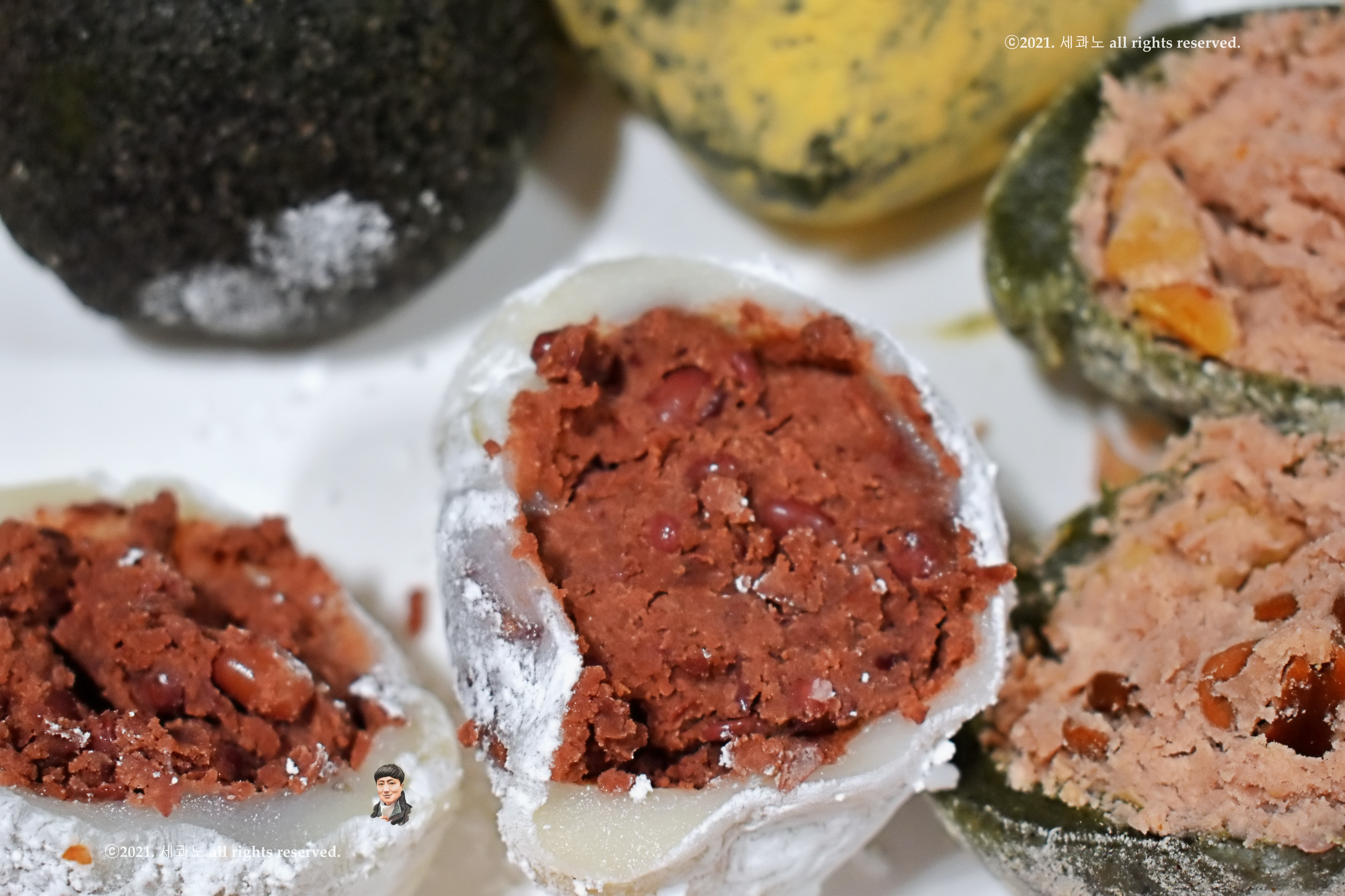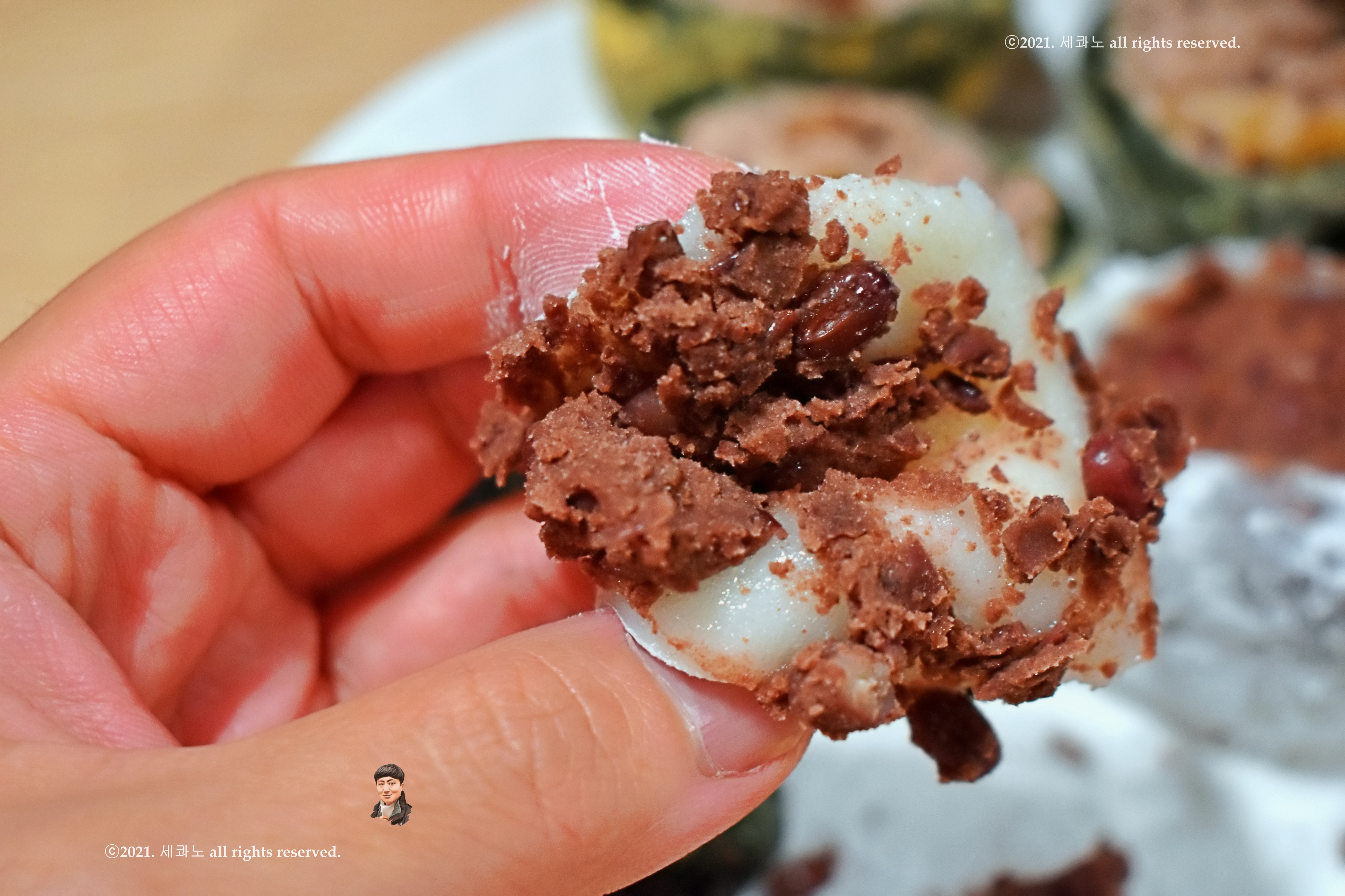 안에는 견과류 소에 찹쌀떡 겉에는 하얀색 거피팥고물 가득했을 텐데..