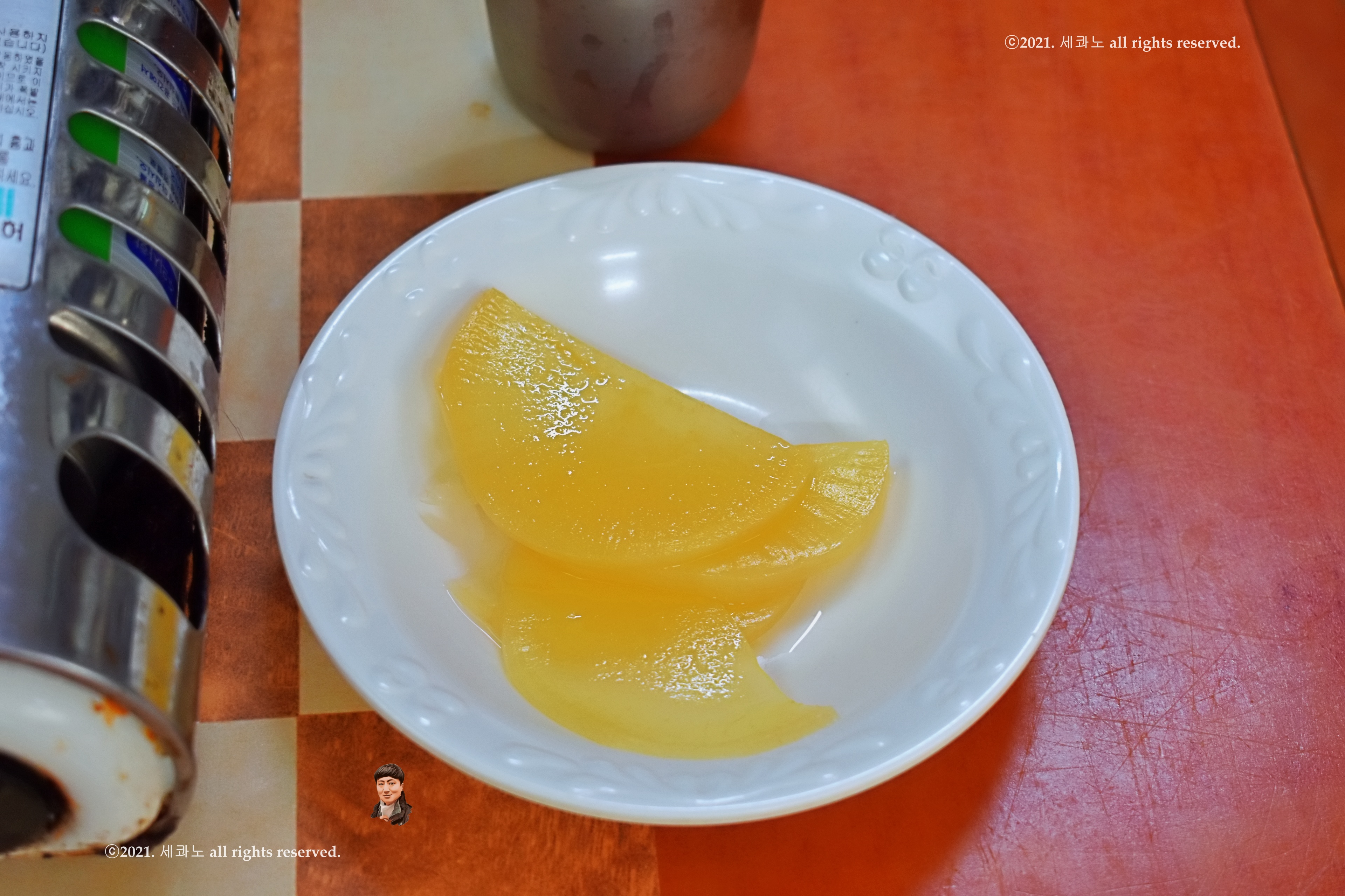 다른 곳보다 하얀색에 가까운 단무지였다.