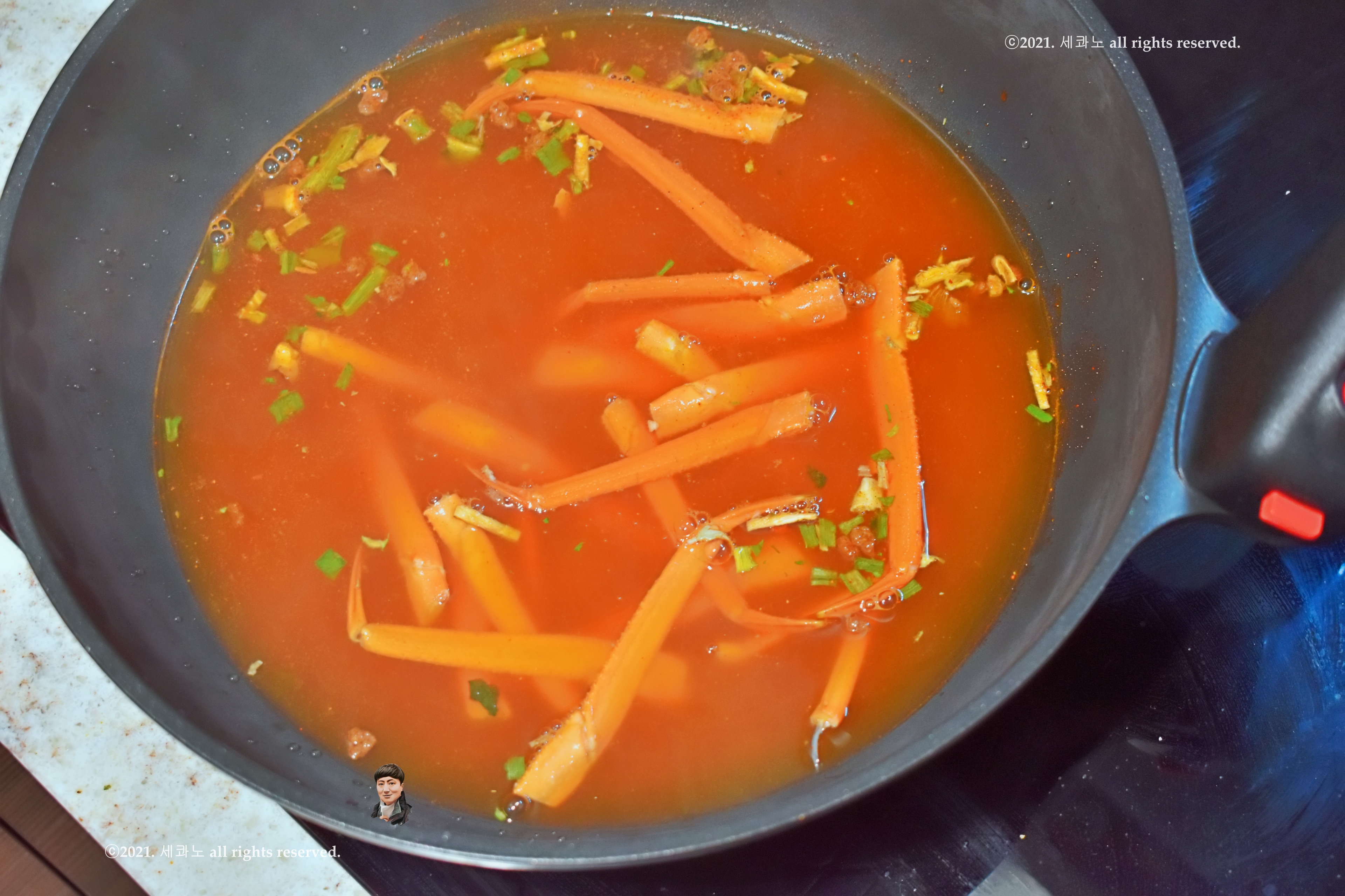뜨거운 물을 부은 뒤 팔팔 끓여 홍게 육수를 내준다.