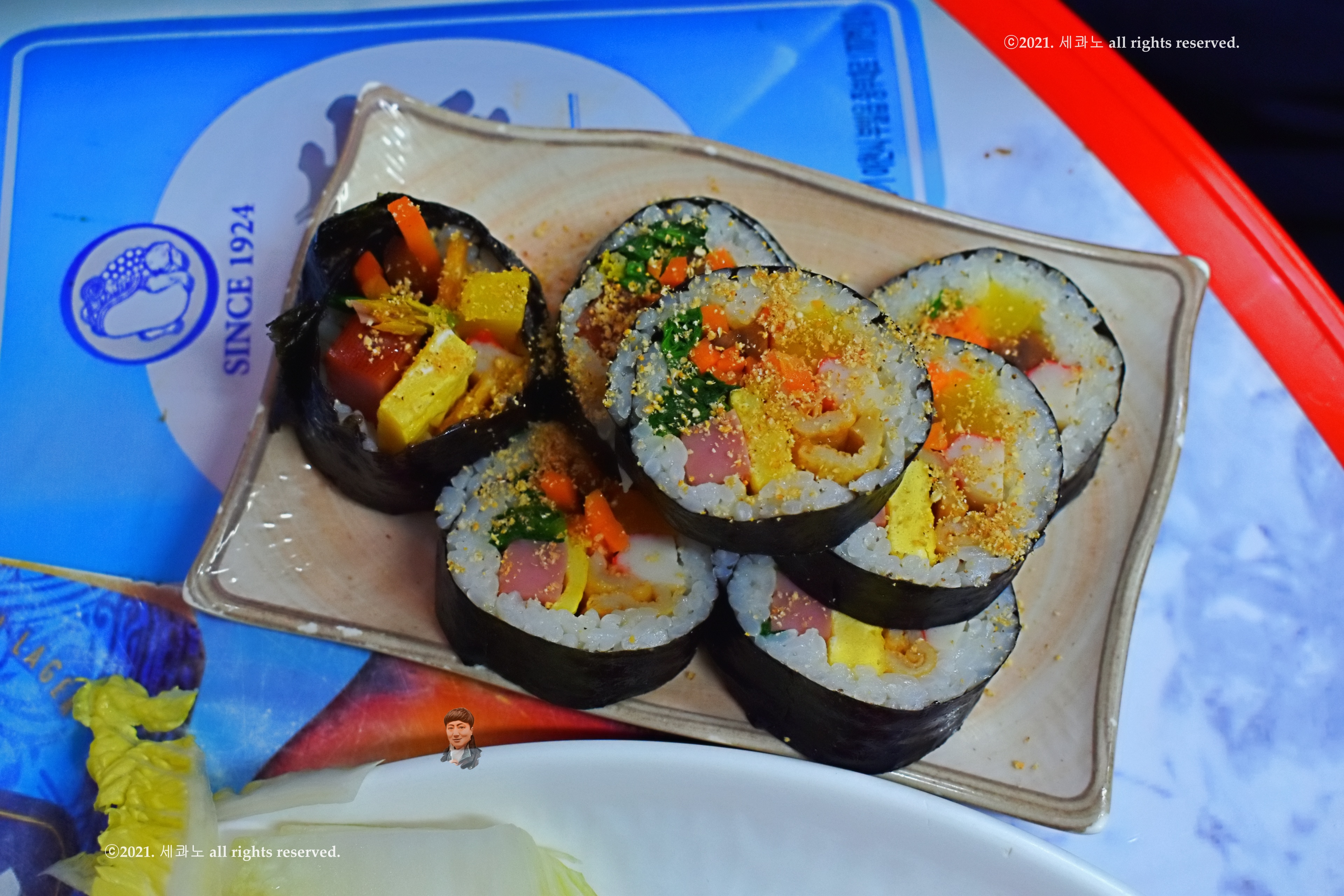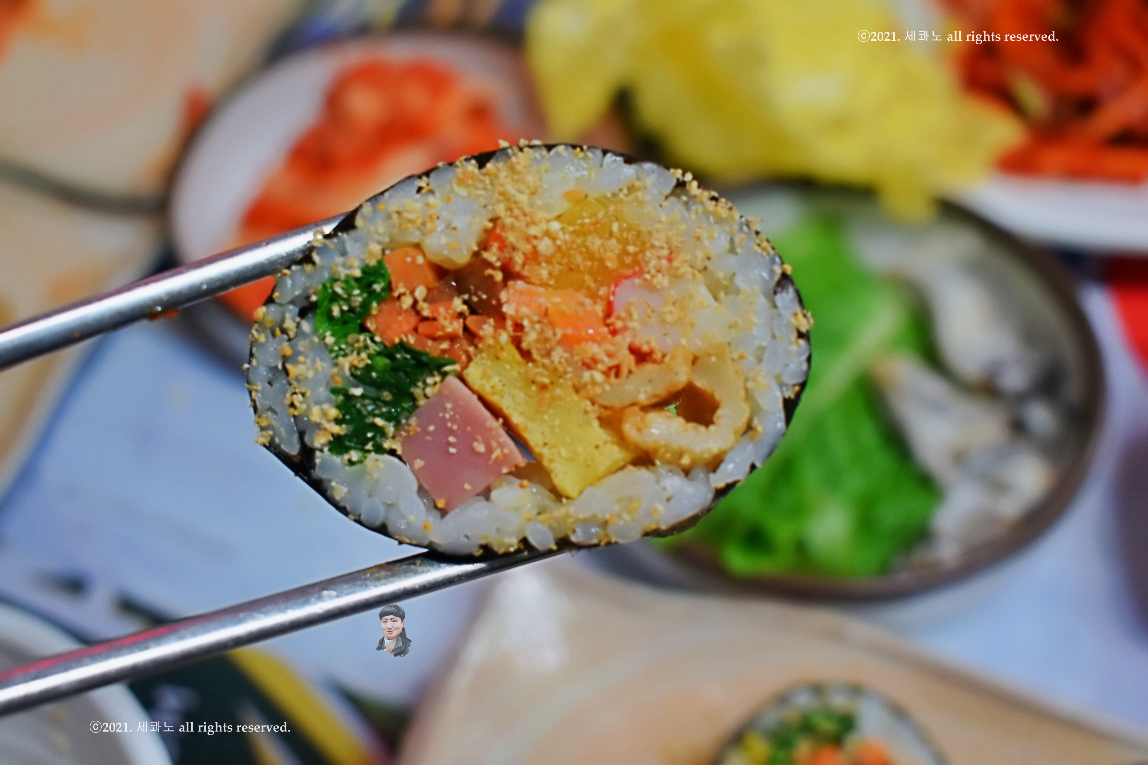 그 위에 깨를 한가득 뿌려 낸 김밥