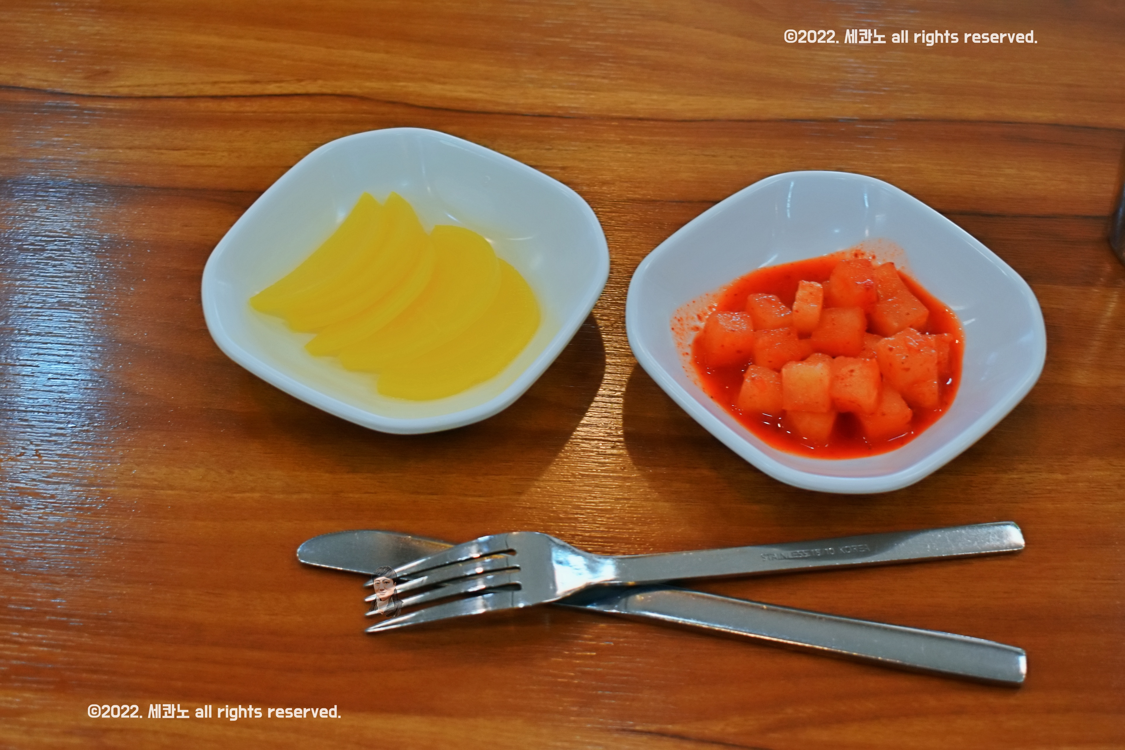 테이블에 앉으면 바로 단무지와 깍두기와 같은