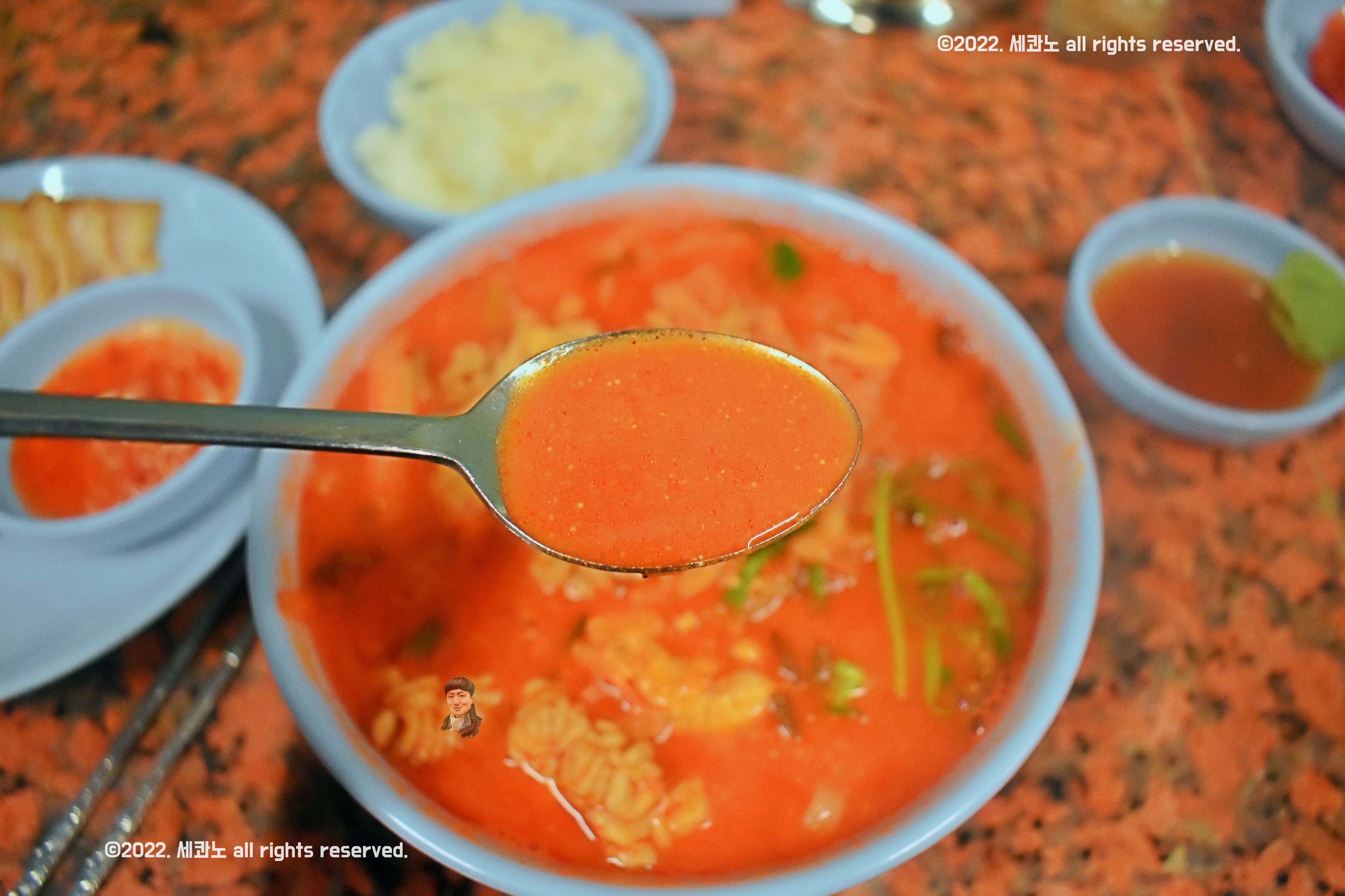 장칼국수 80에 매운탕 20이 정도의 비율로 섞인 느낌?