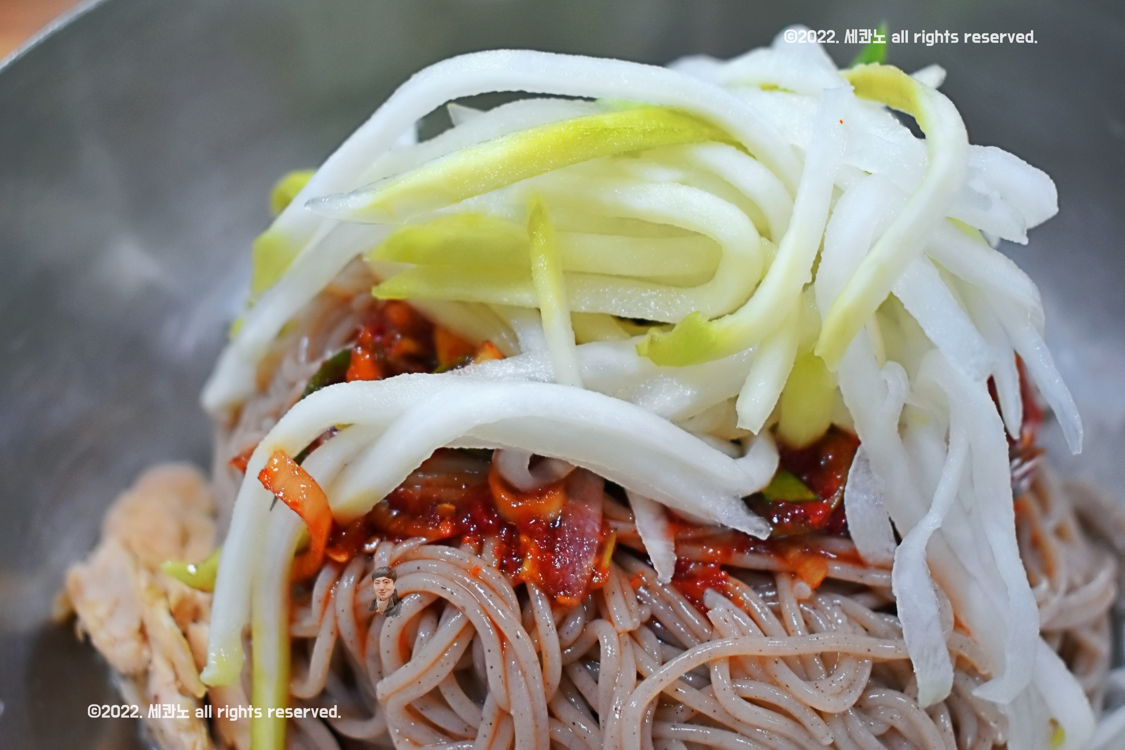 매콤하면서도 달콤한 양념장에 비벼 먹는 비빔 막국수와