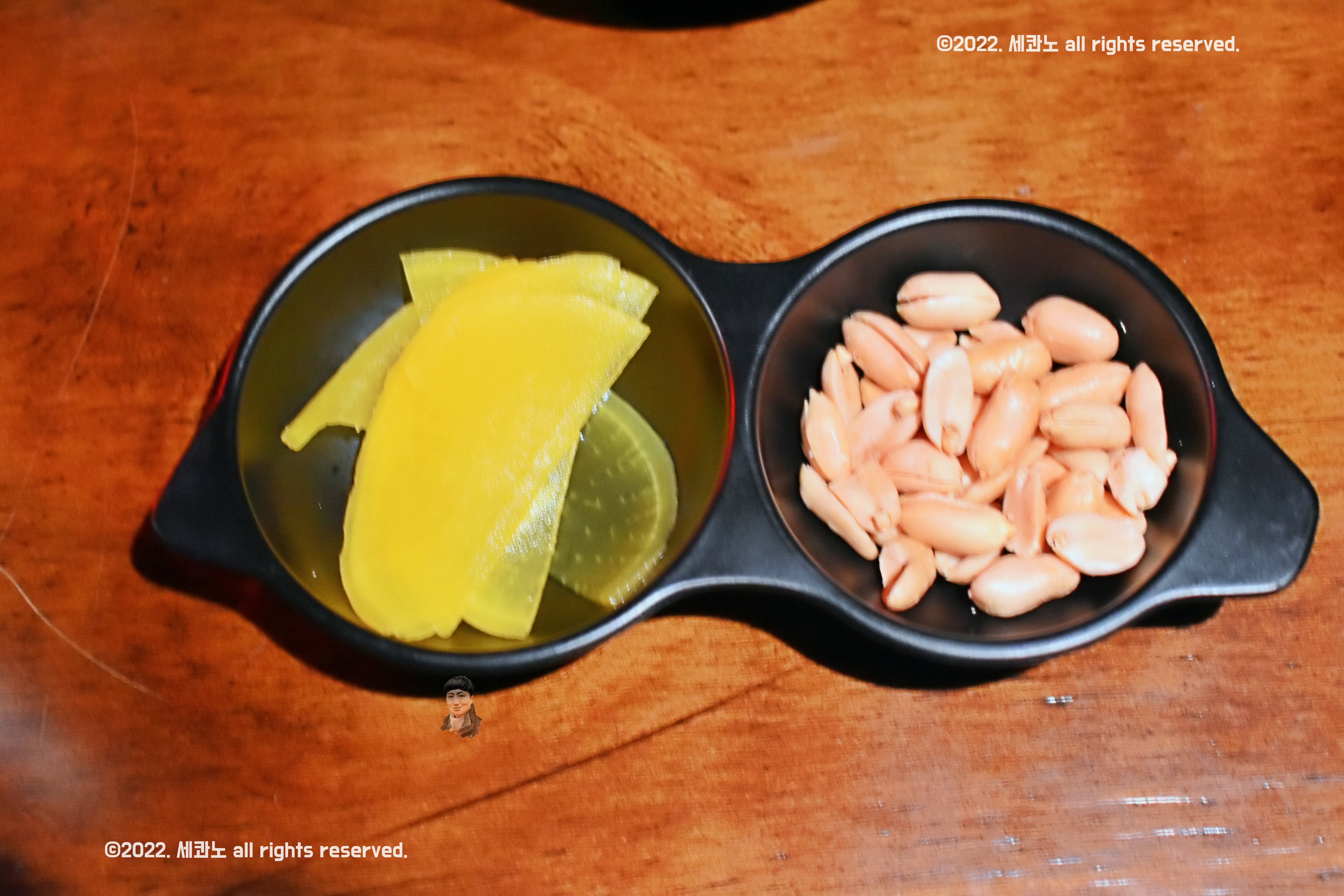 매운맛을 달래줄 수 있는 단무지와 땅콩이 기본찬으로 있는 것 같고