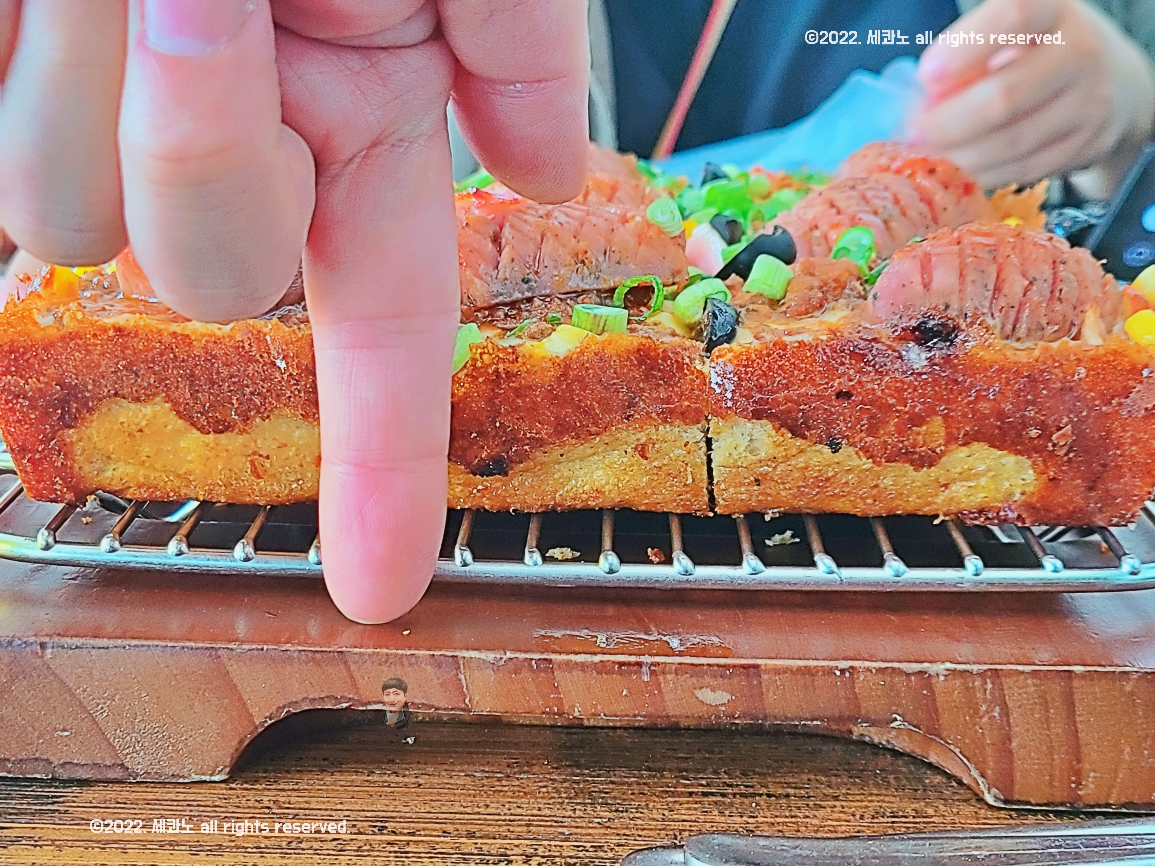 도우 바깥쪽으로 치즈가 눌어붙어 있다.