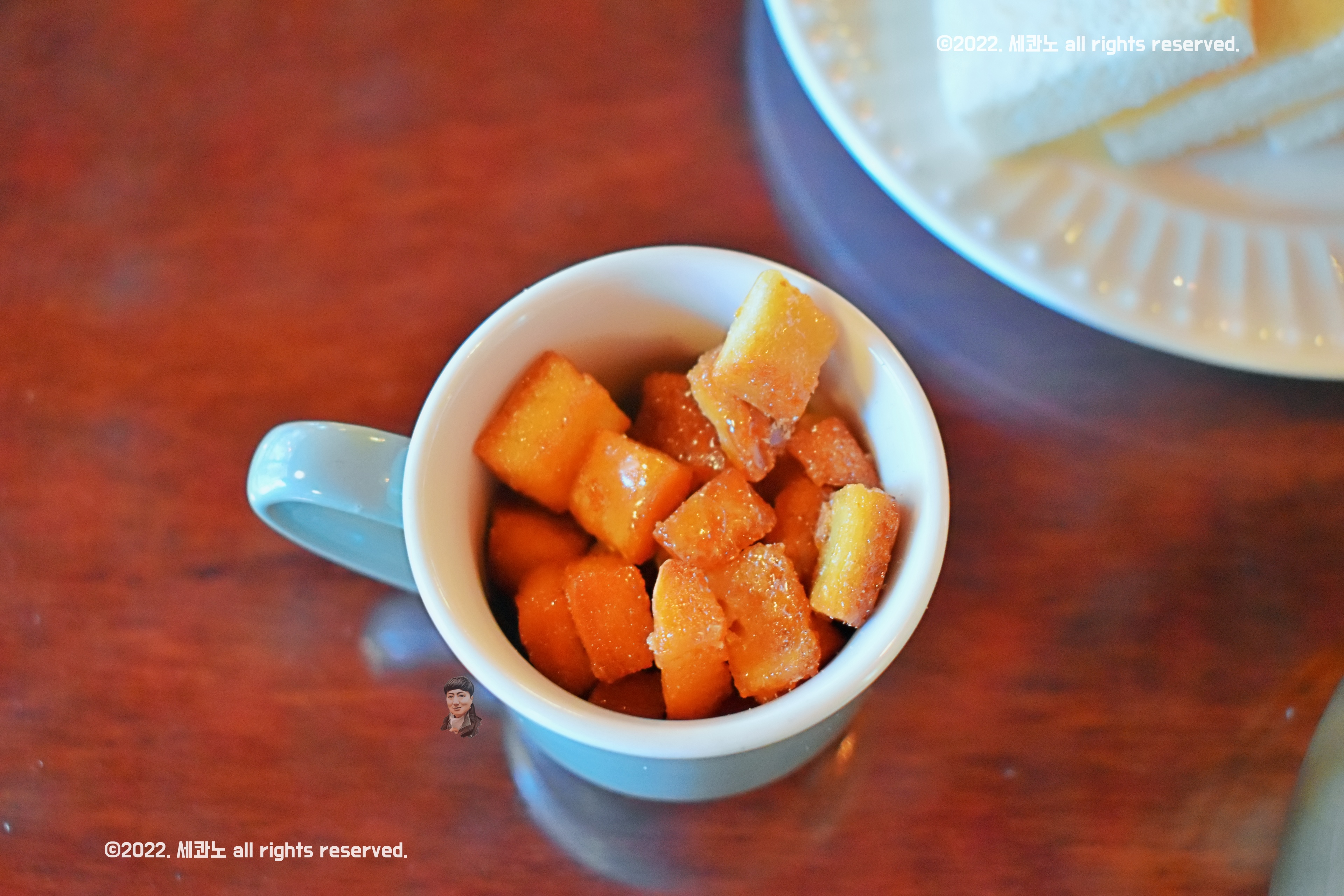 식빵이 식전빵으로, 그리고 그 엣지를 잘라 튀겨낸 달고나 러스크가 후식으로 나왔다.