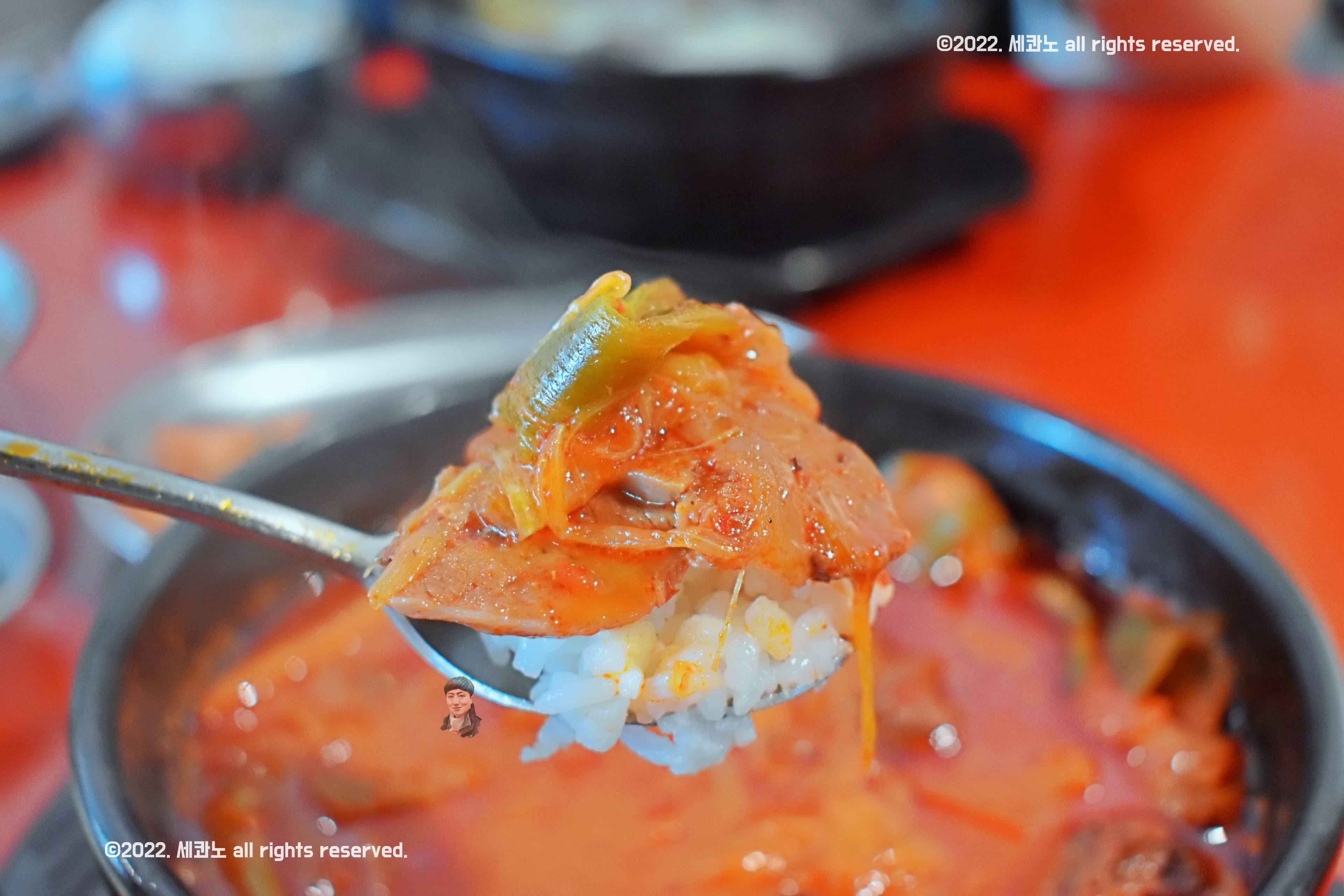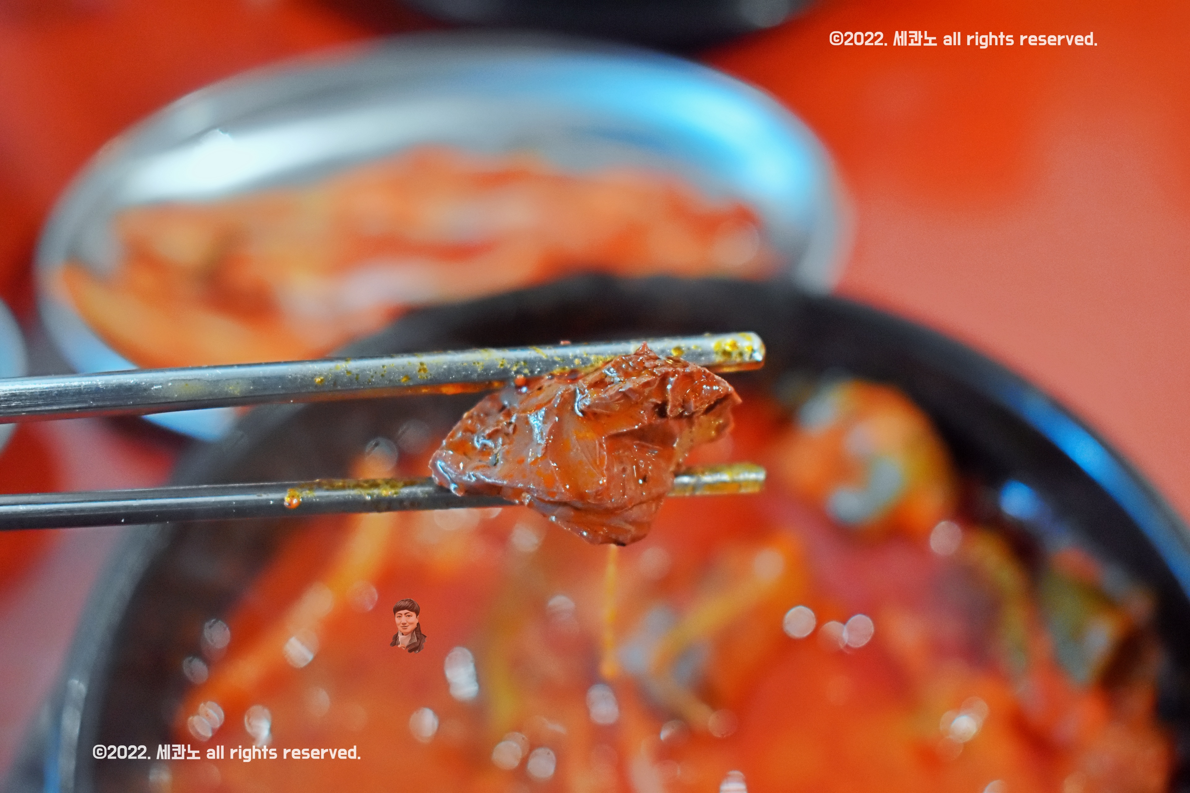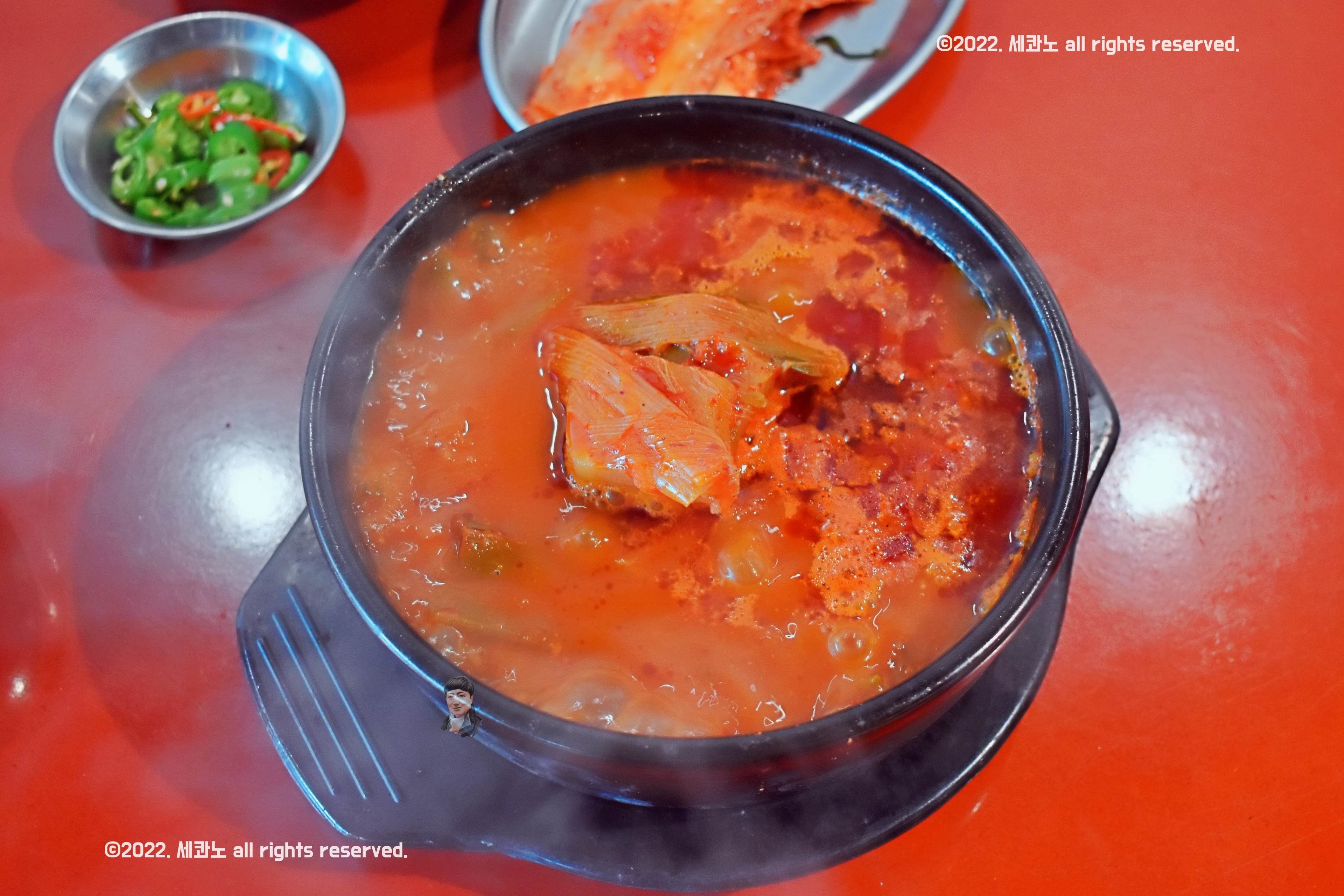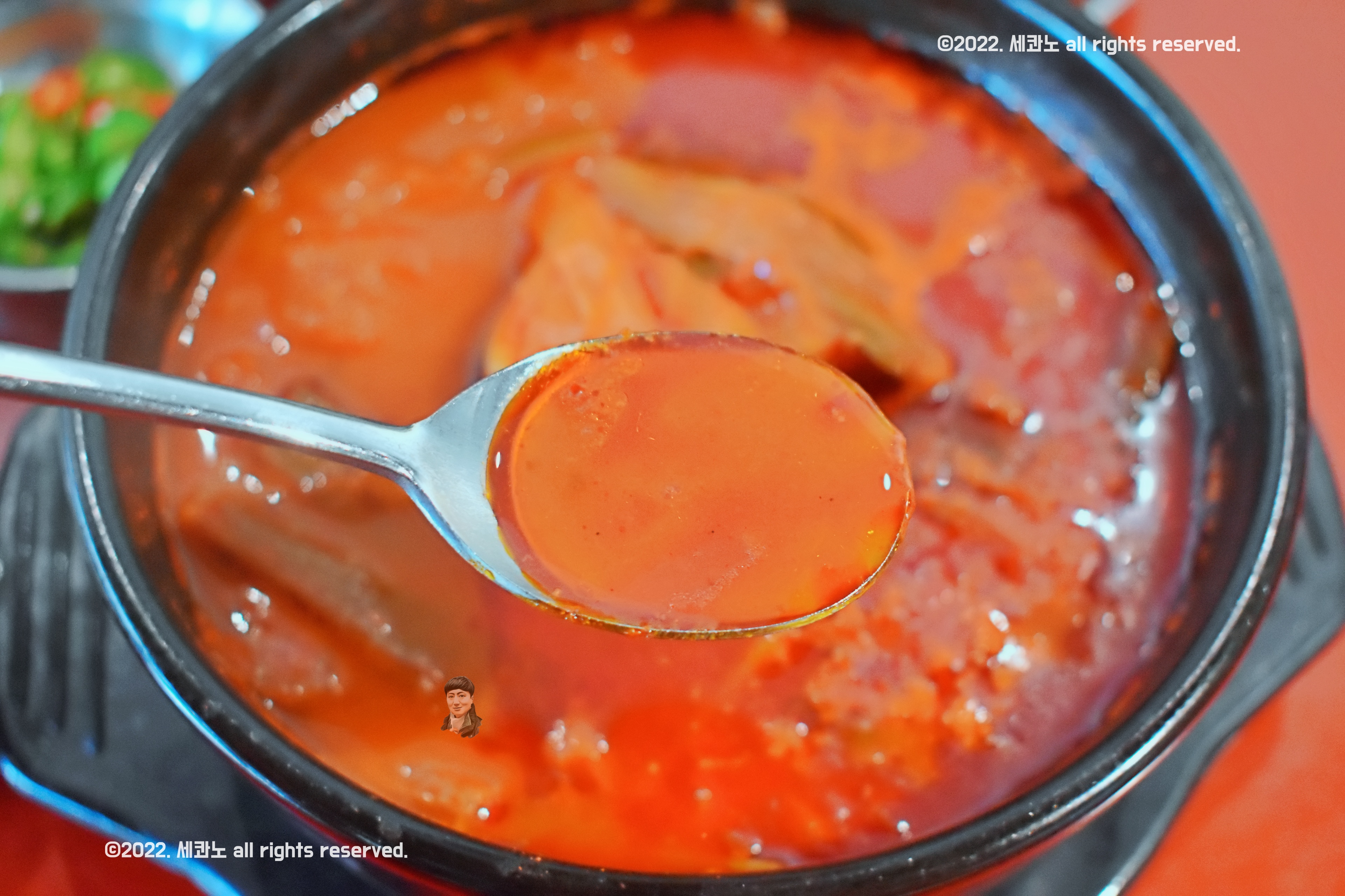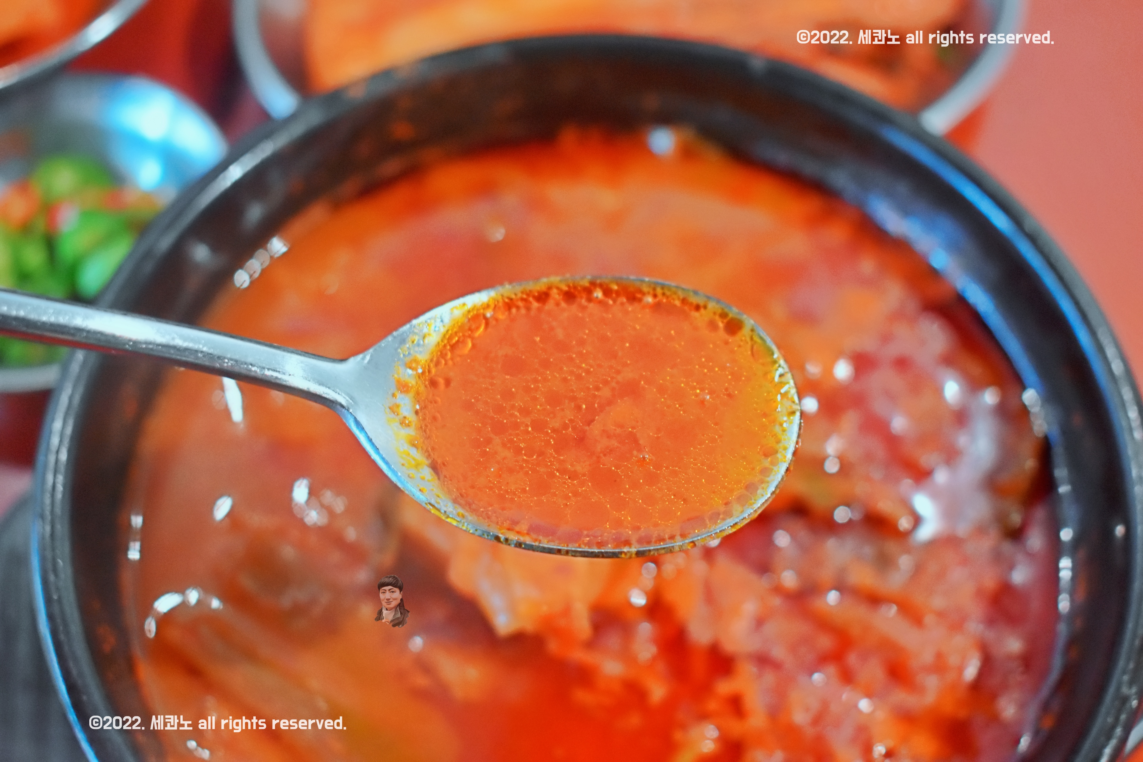 뚝배기의 절반쯤 고추기름이 둥둥 떠 있어서