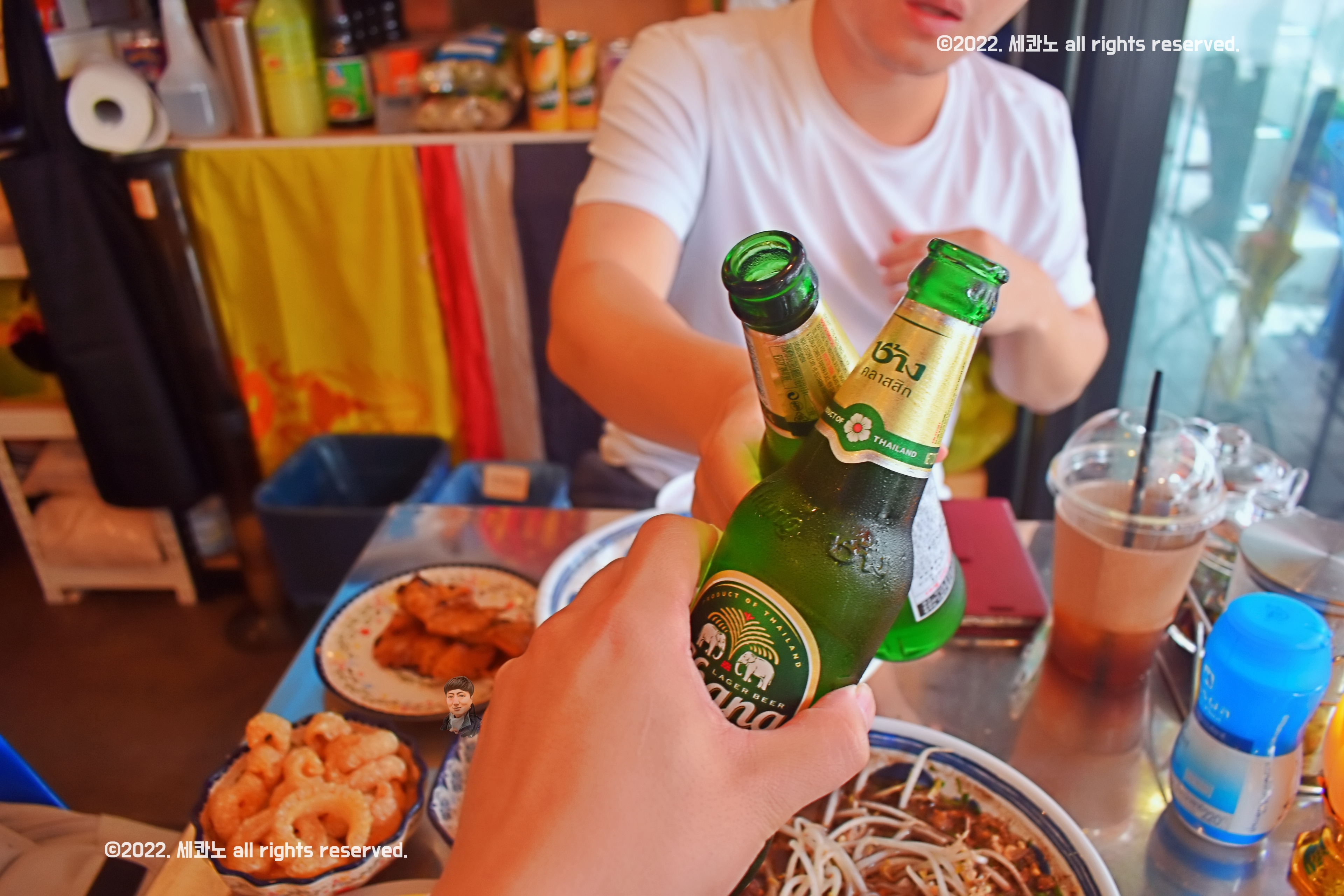우선 쌀국수, 텃만꿍, 캡무, 고수, 태국 맥주가 가장 먼저 서빙되어