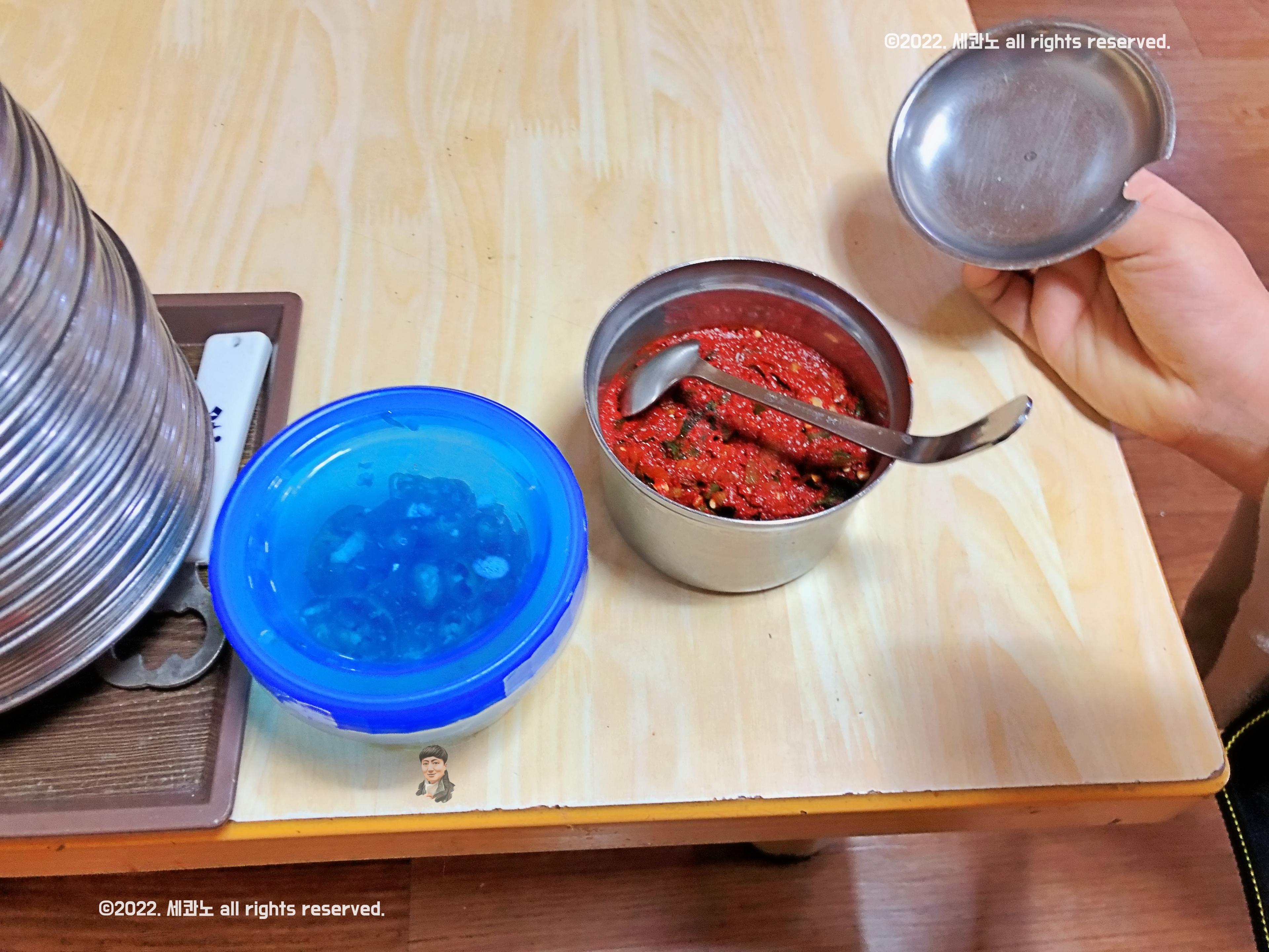 테이블에 준비되어 있는 양념장과 청양고추
