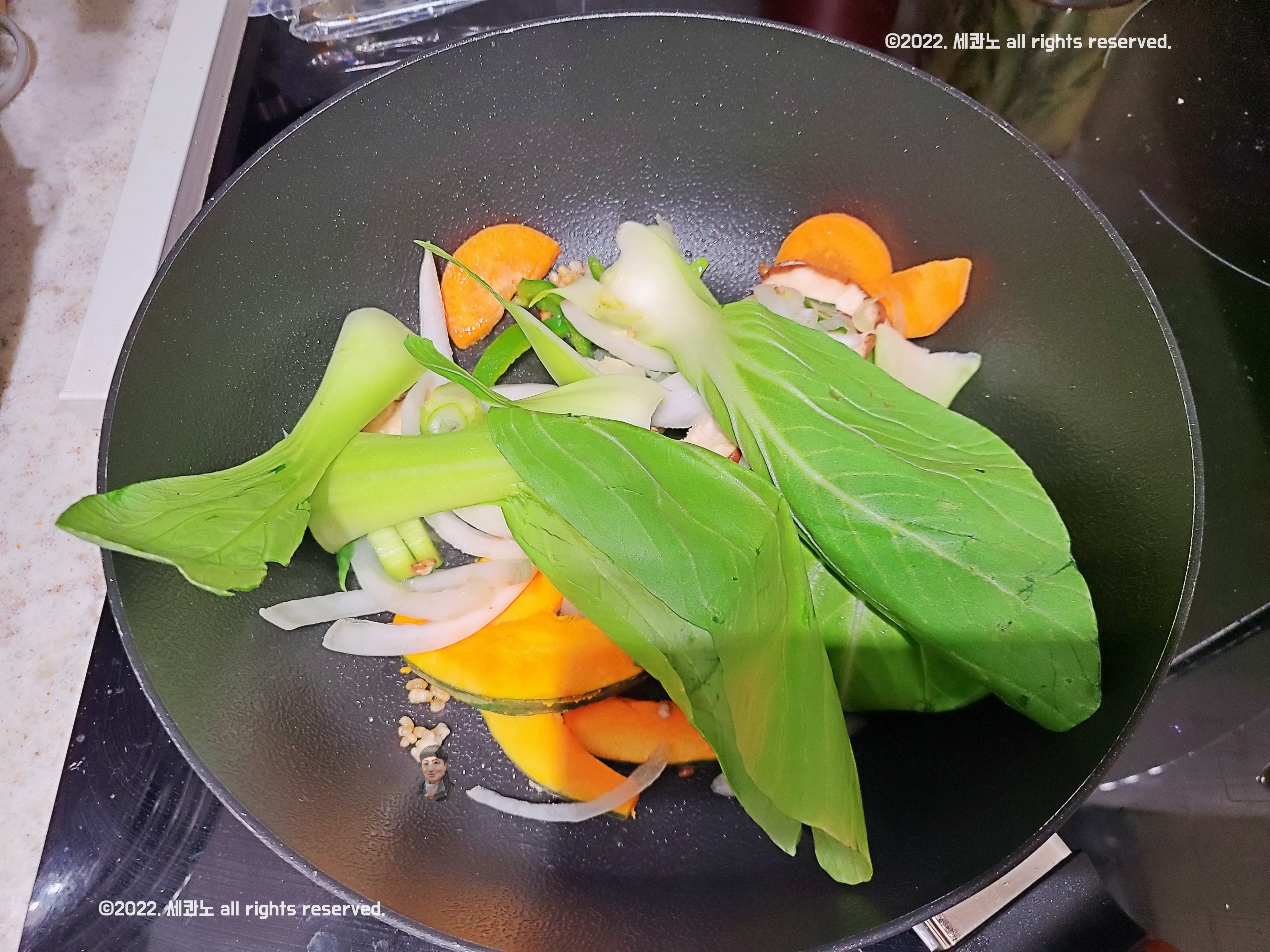 청경채는 마지막에 사용하는데 실수로 같이 넣어버렸다.