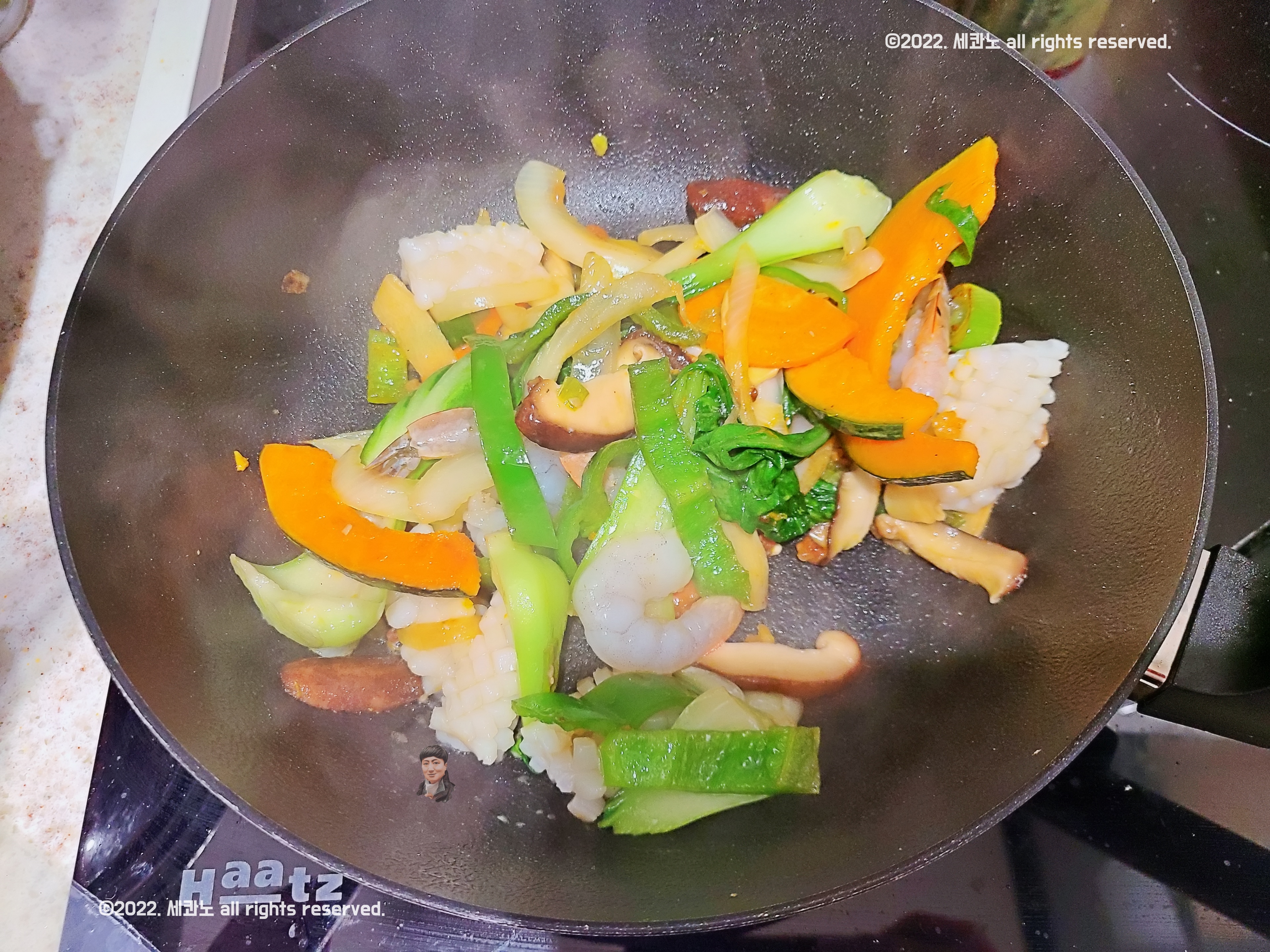 해산물을 넣고 2분간 쎈 불에서 볶은 뒤,
