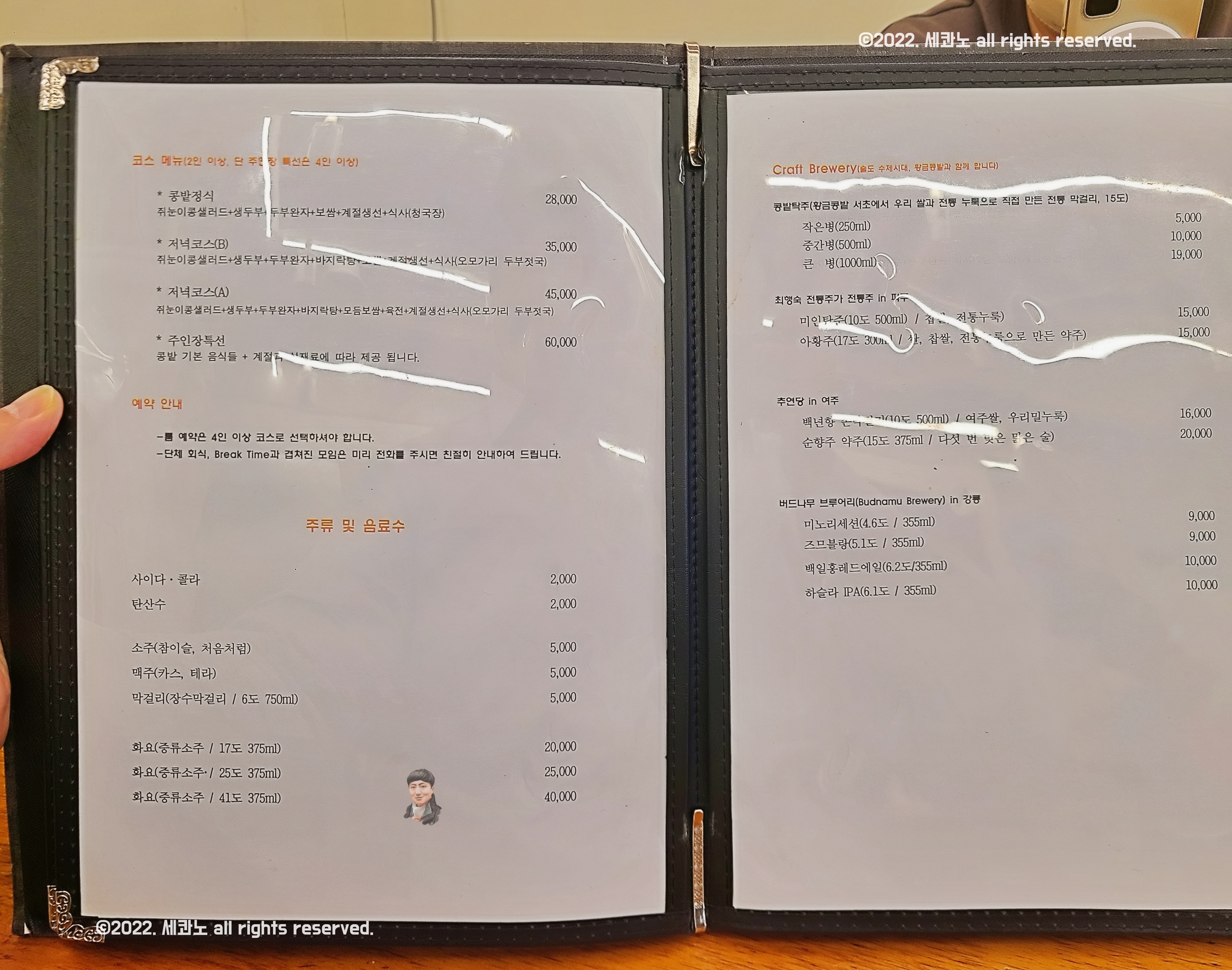 각종 정식 메뉴와 주류 및 음료수 메뉴판, 가격이고