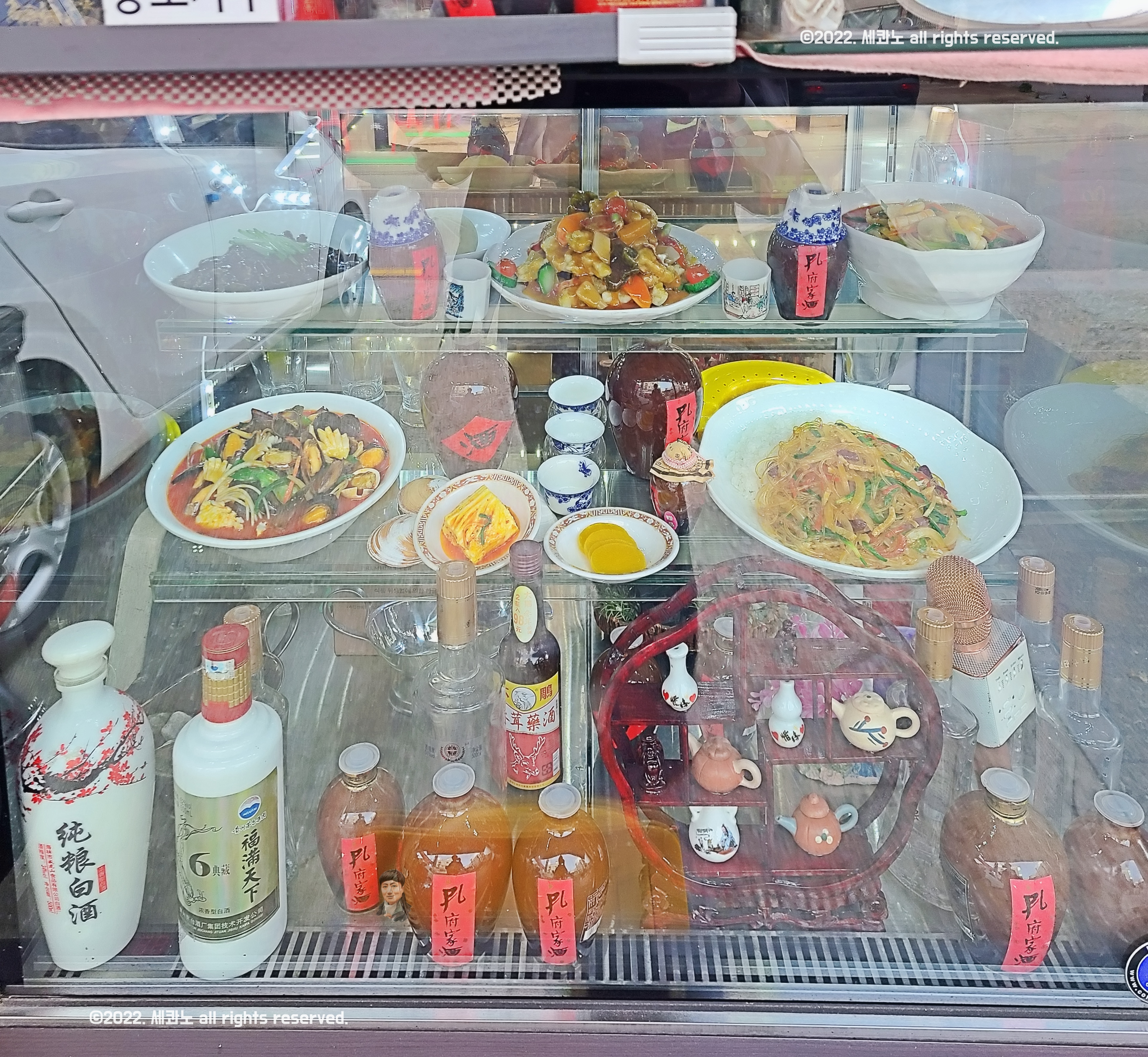 가게에서 팔고 있는 각종 요리와 '술'이 전시되어 있었고