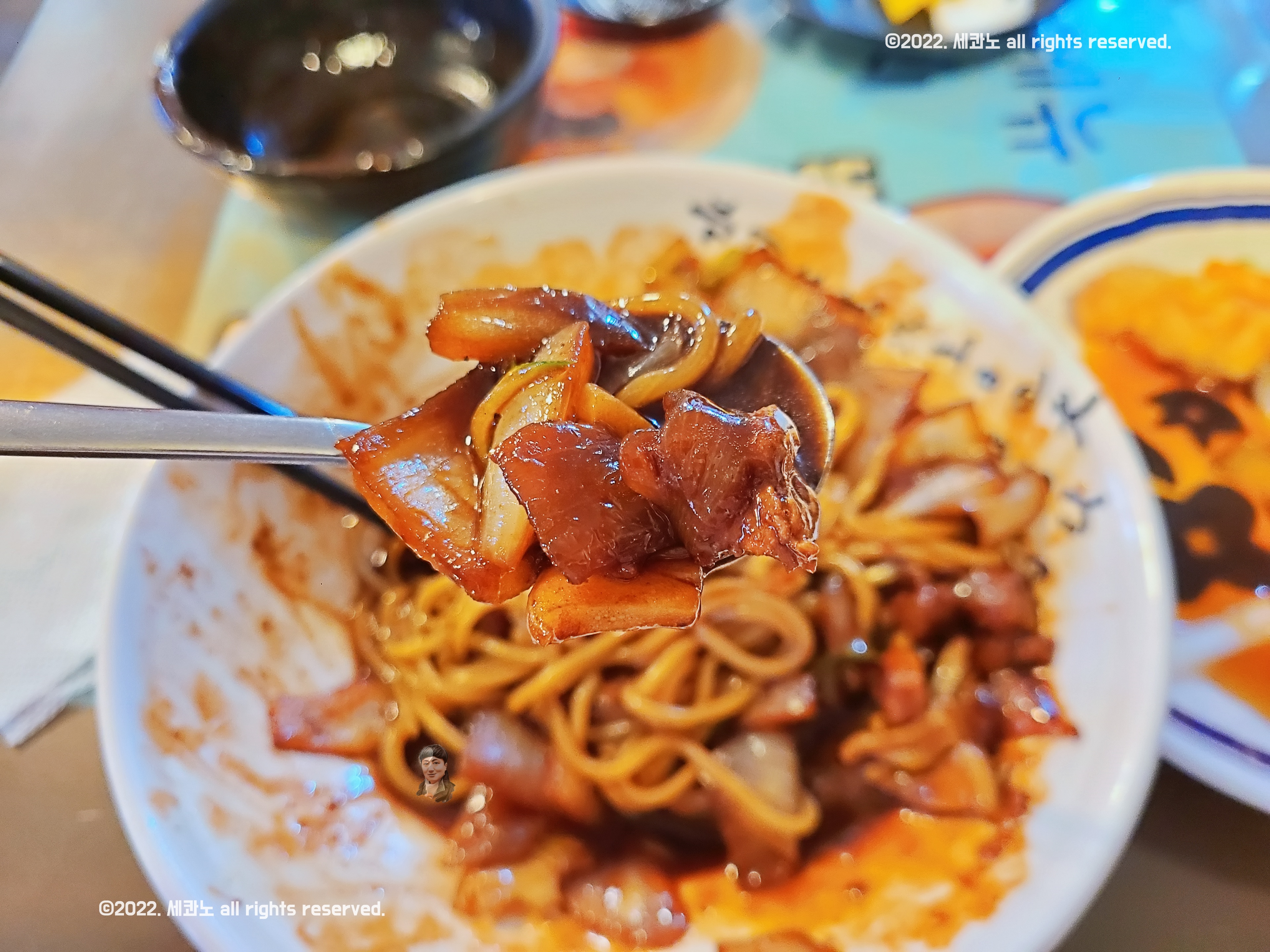 짜장 소스에 돼지고기는 좀 큼지막하게 썰려 들어가 있었지만