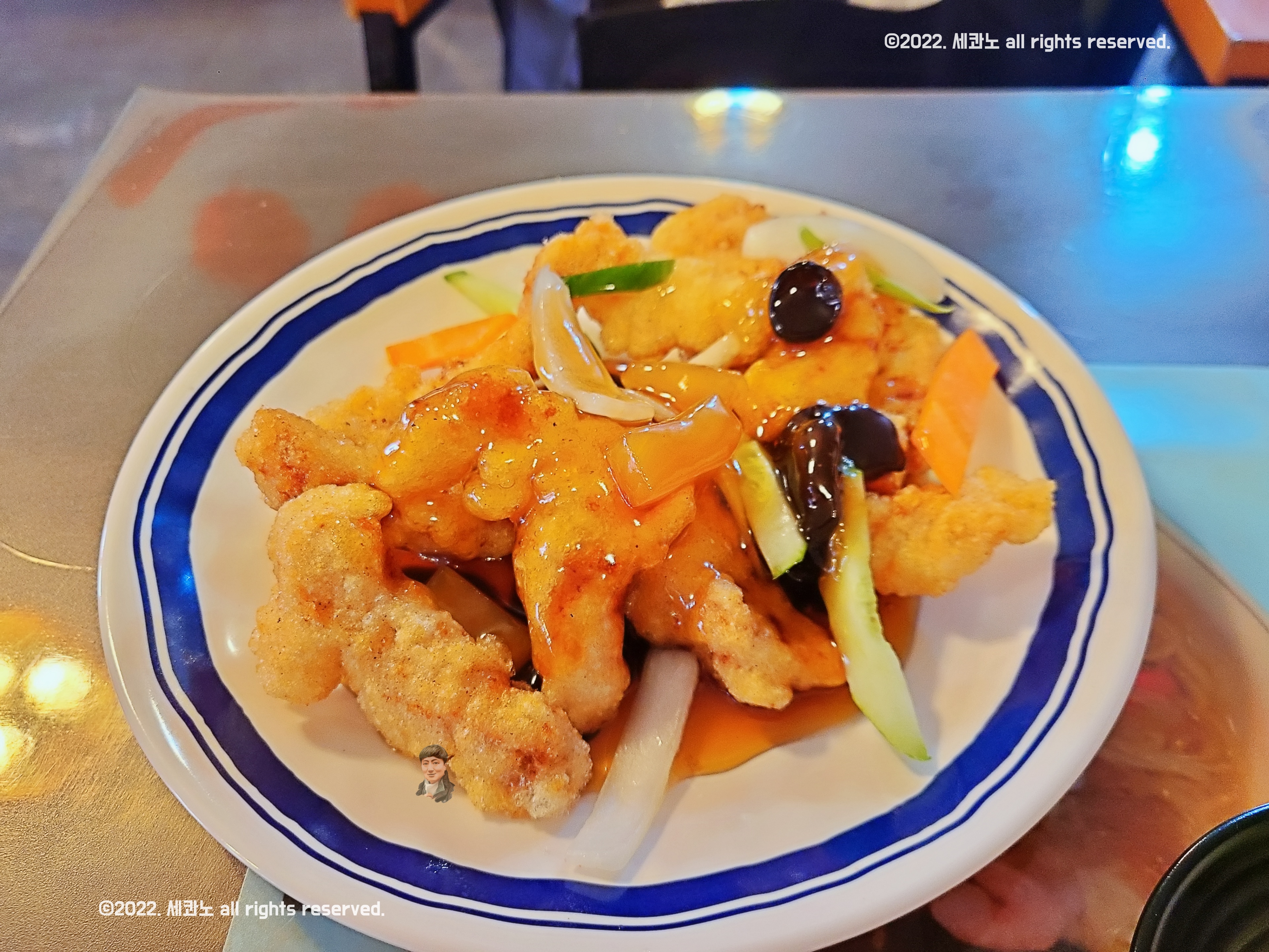 거기에 소스는 조금 옛날 탕수육 소스로 신맛이 강한 편