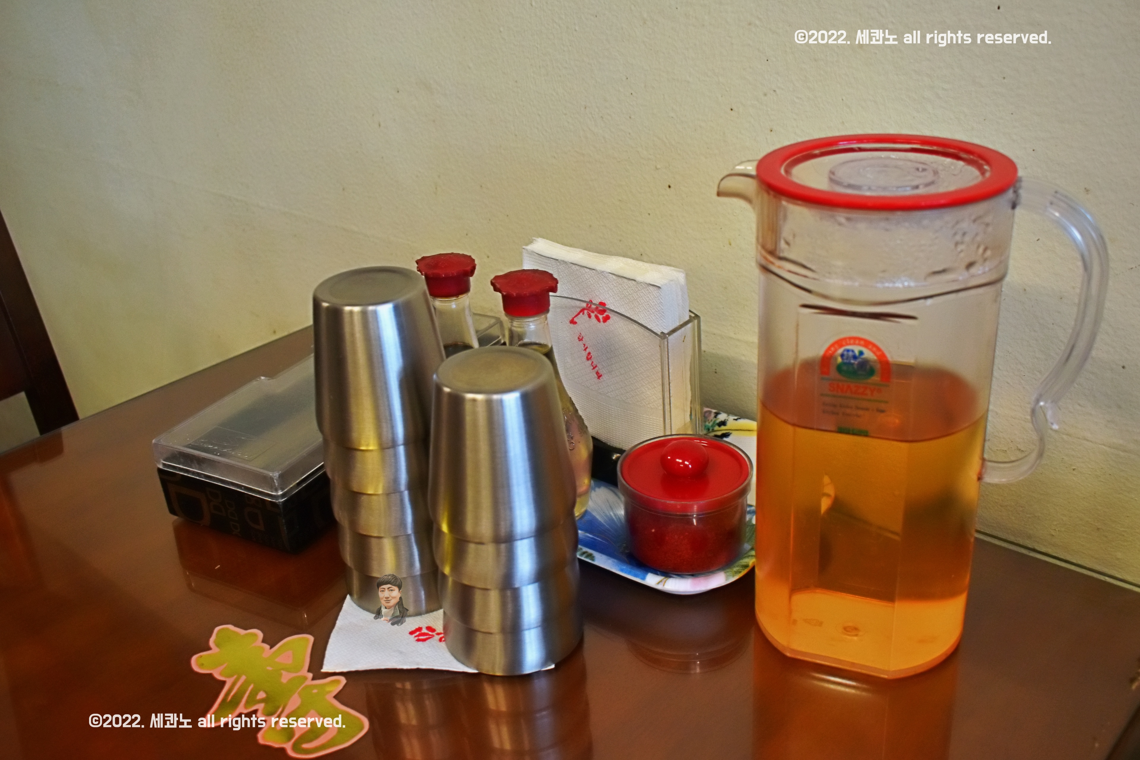 테이블에 간장, 식초, 고춧가루가 있으니