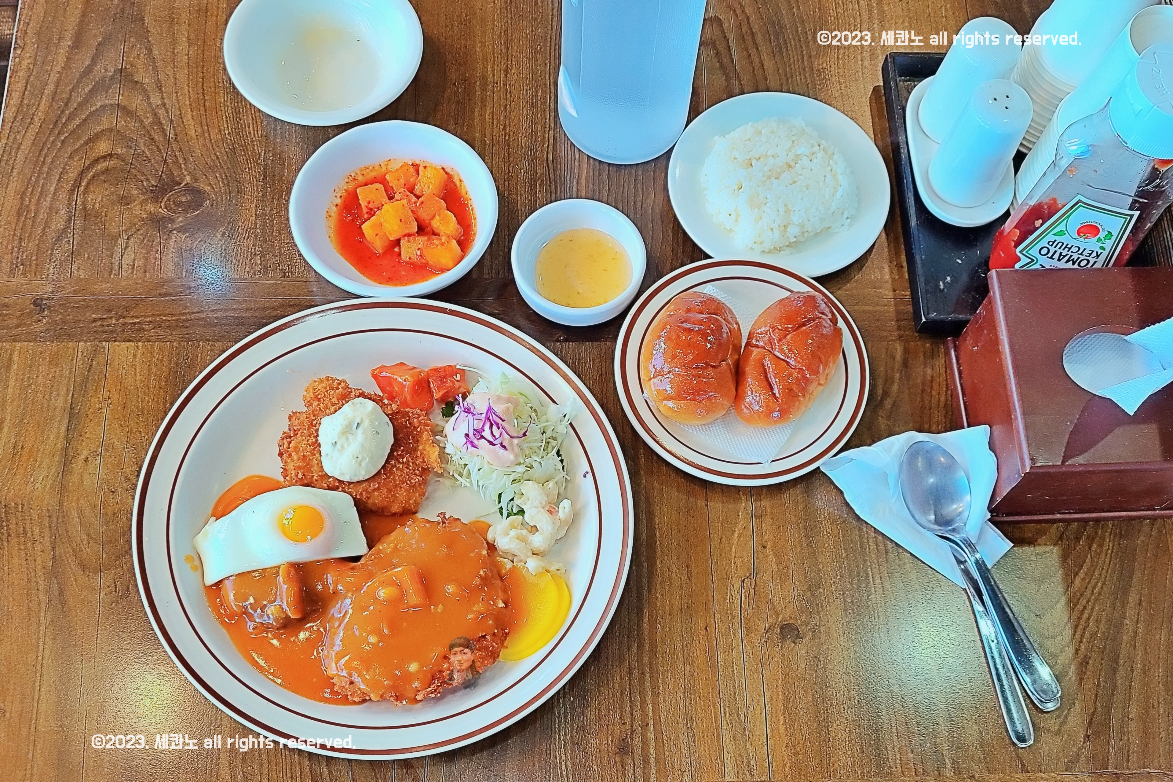 잠실 경양식 돈까스는 이렇게 생긴 돈까스가 두 덩어리 나오고