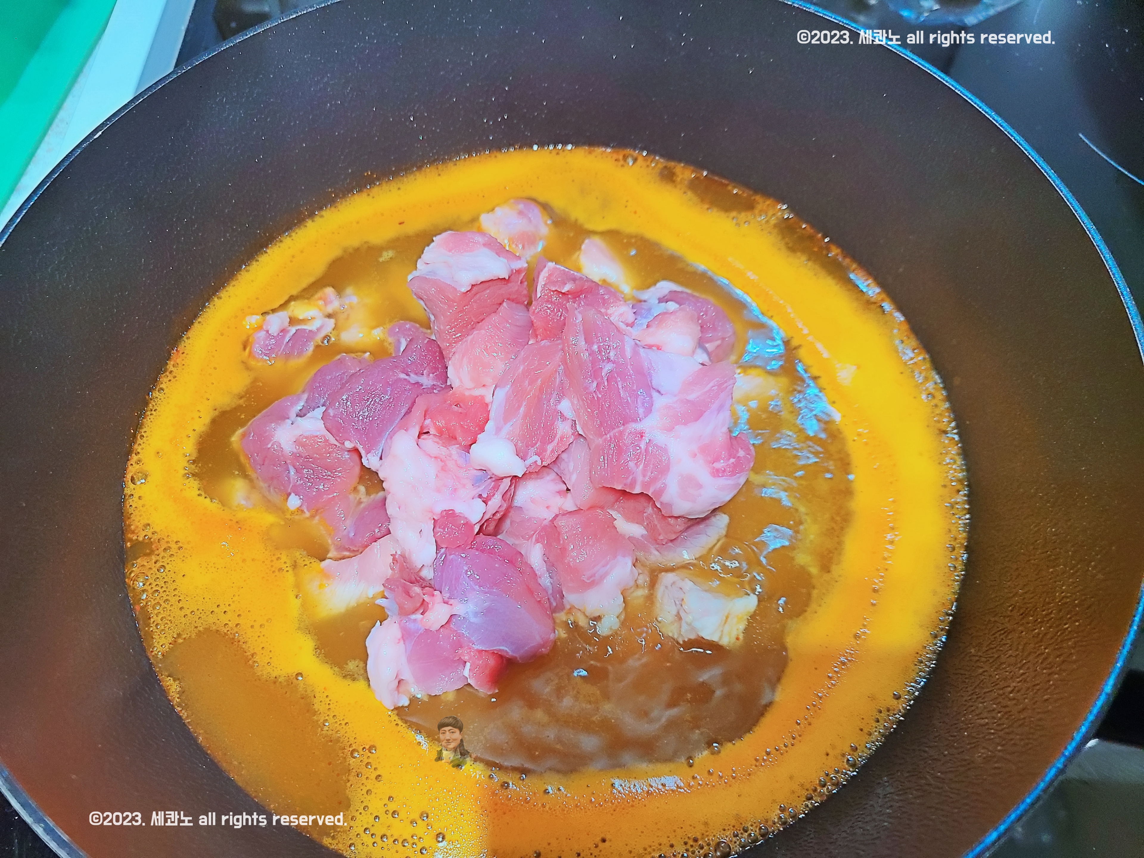 준비된 부재료, 여기서는 고기를 넣고 끓여준다.