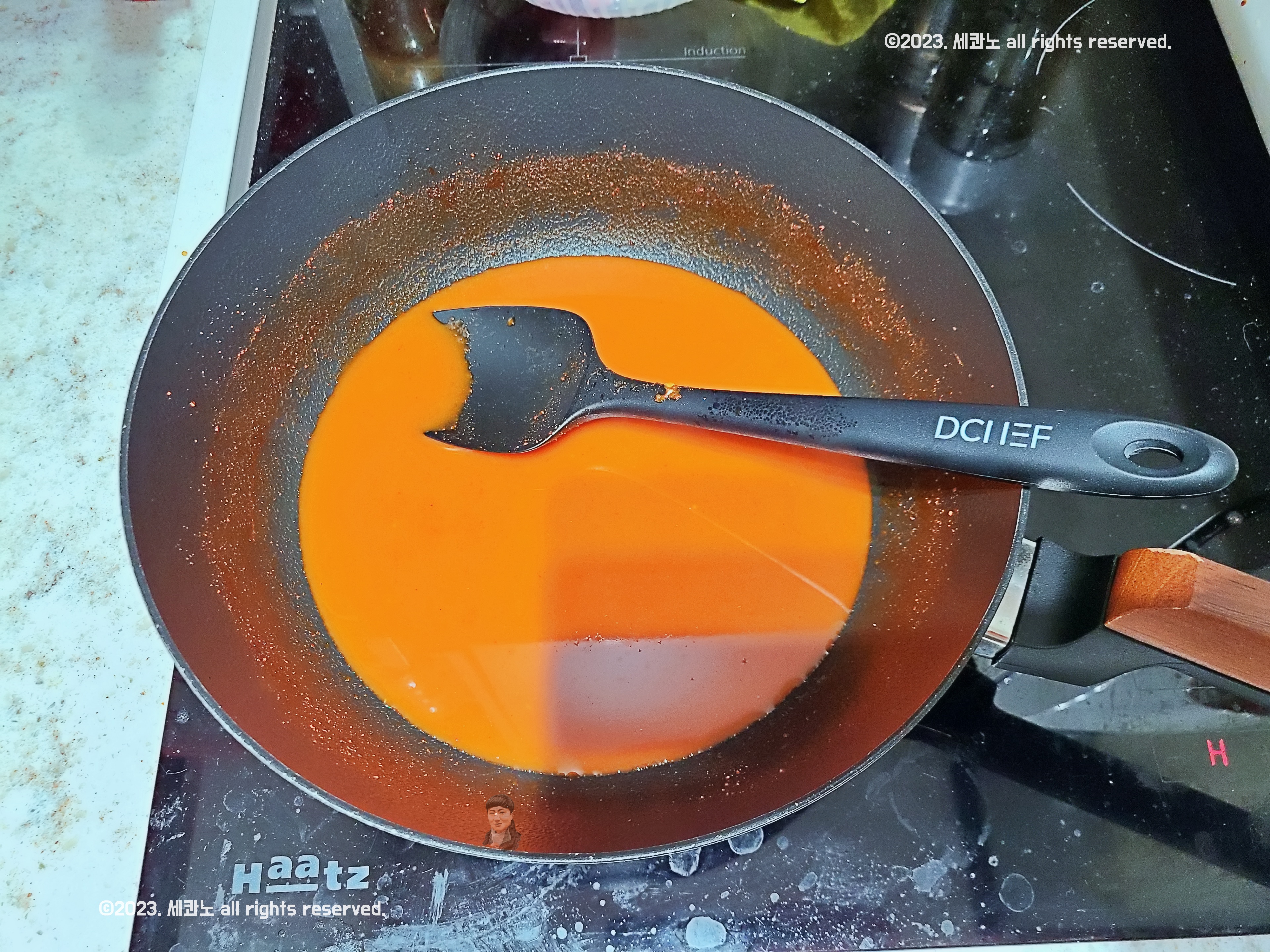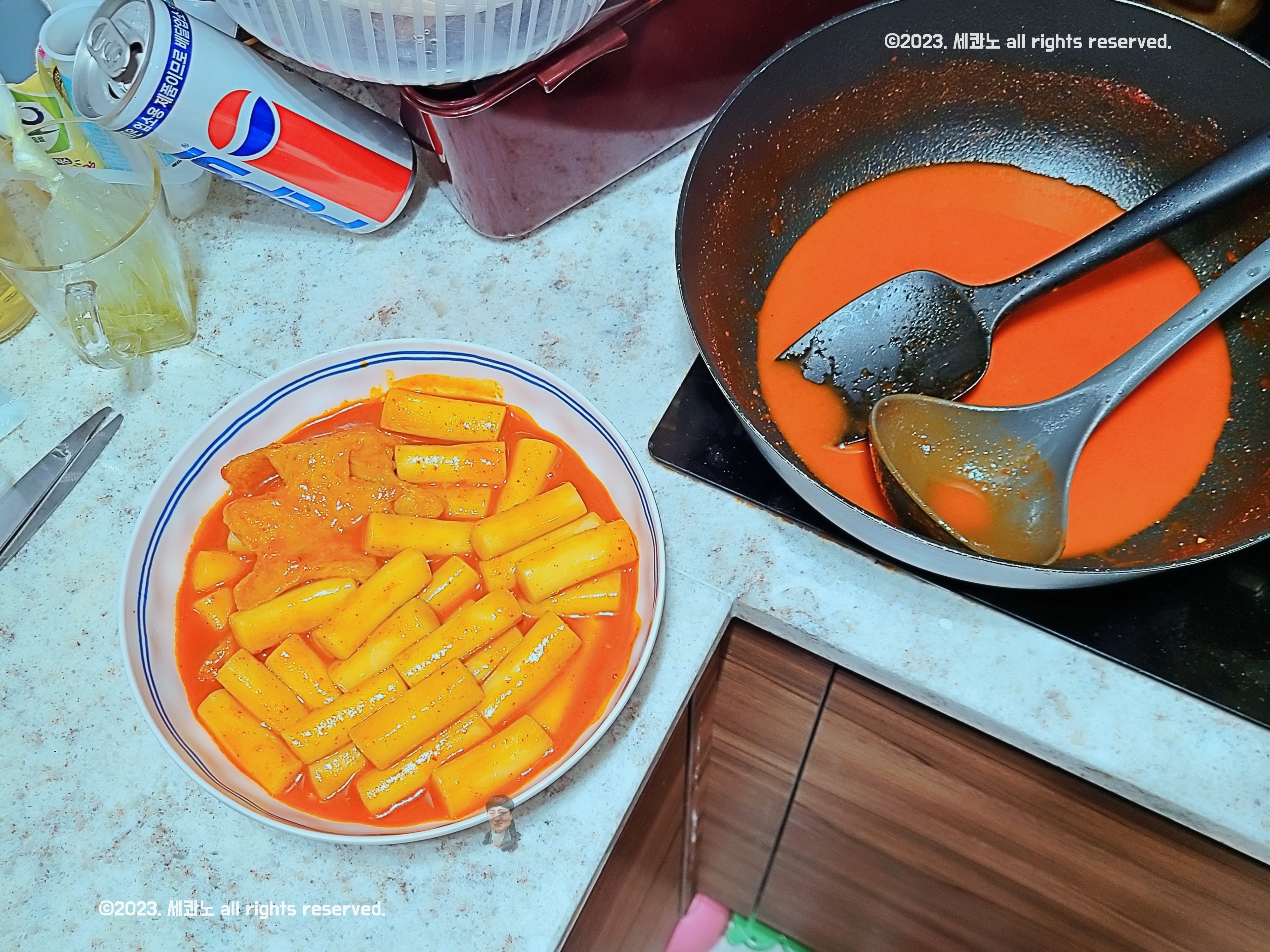 쌀떡이 팬에 더 달라붙는 느낌이 있었다.