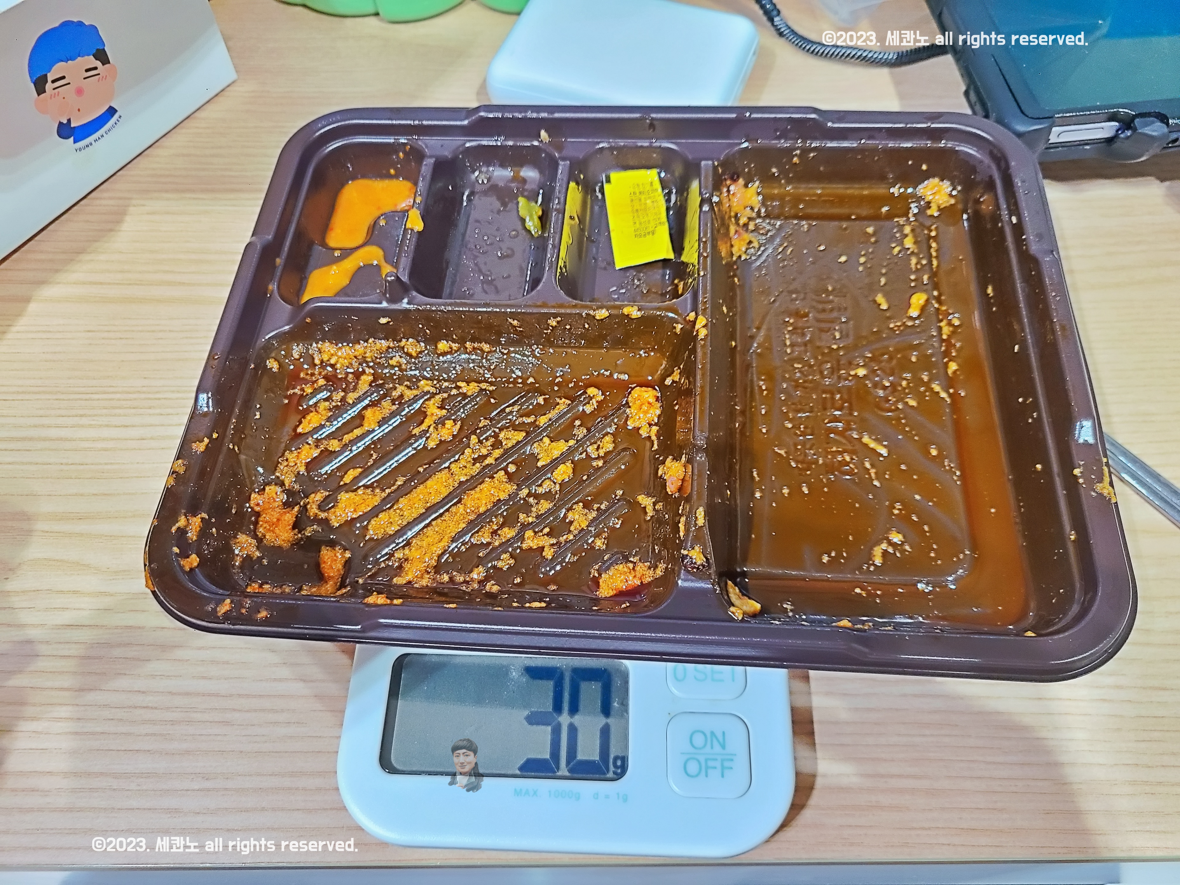 양념이 남아 있는 빈 용기의 무게가 30g이다.