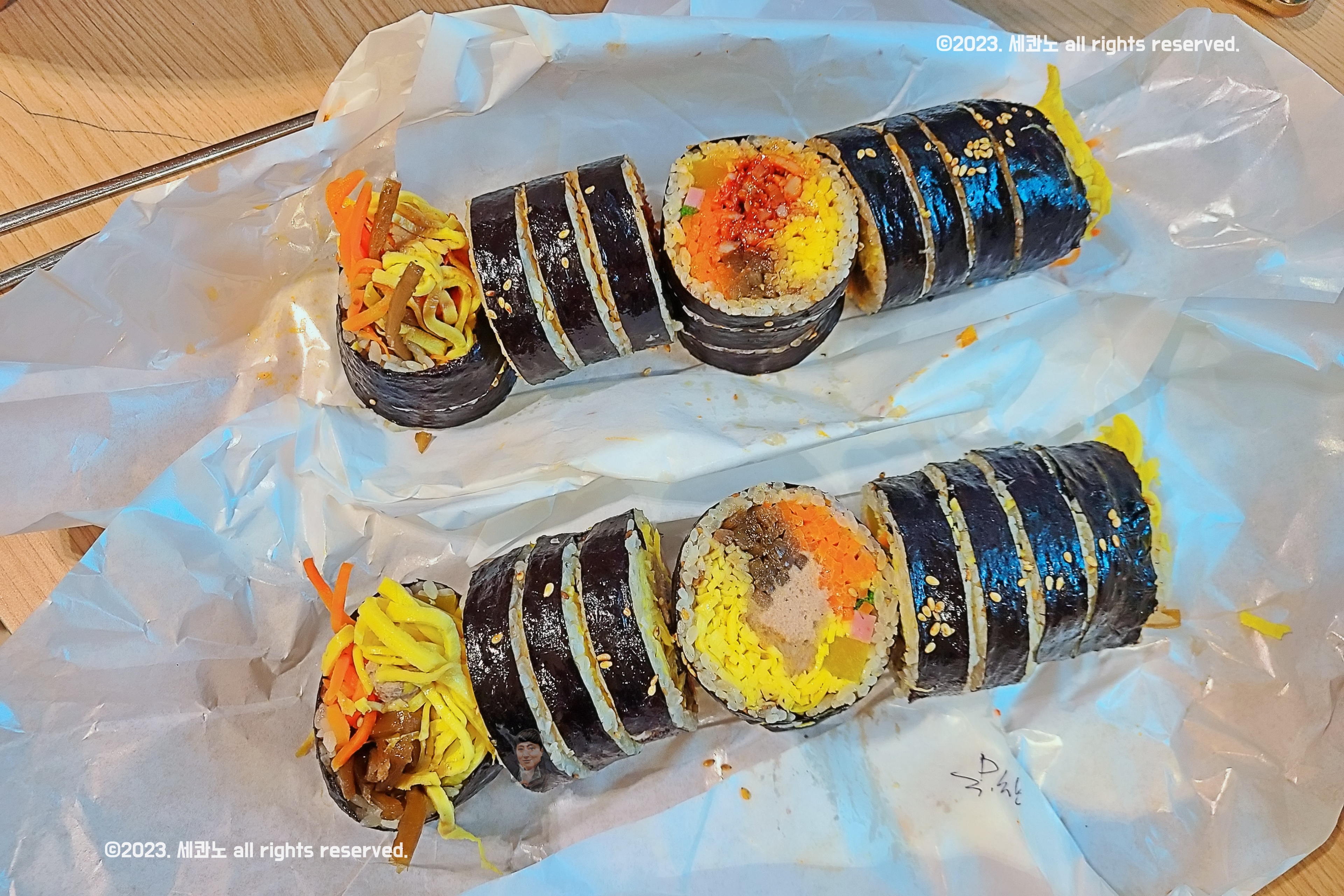 포장지에 볼펜으로 김밥의 종류가 표시되어 있었다.
