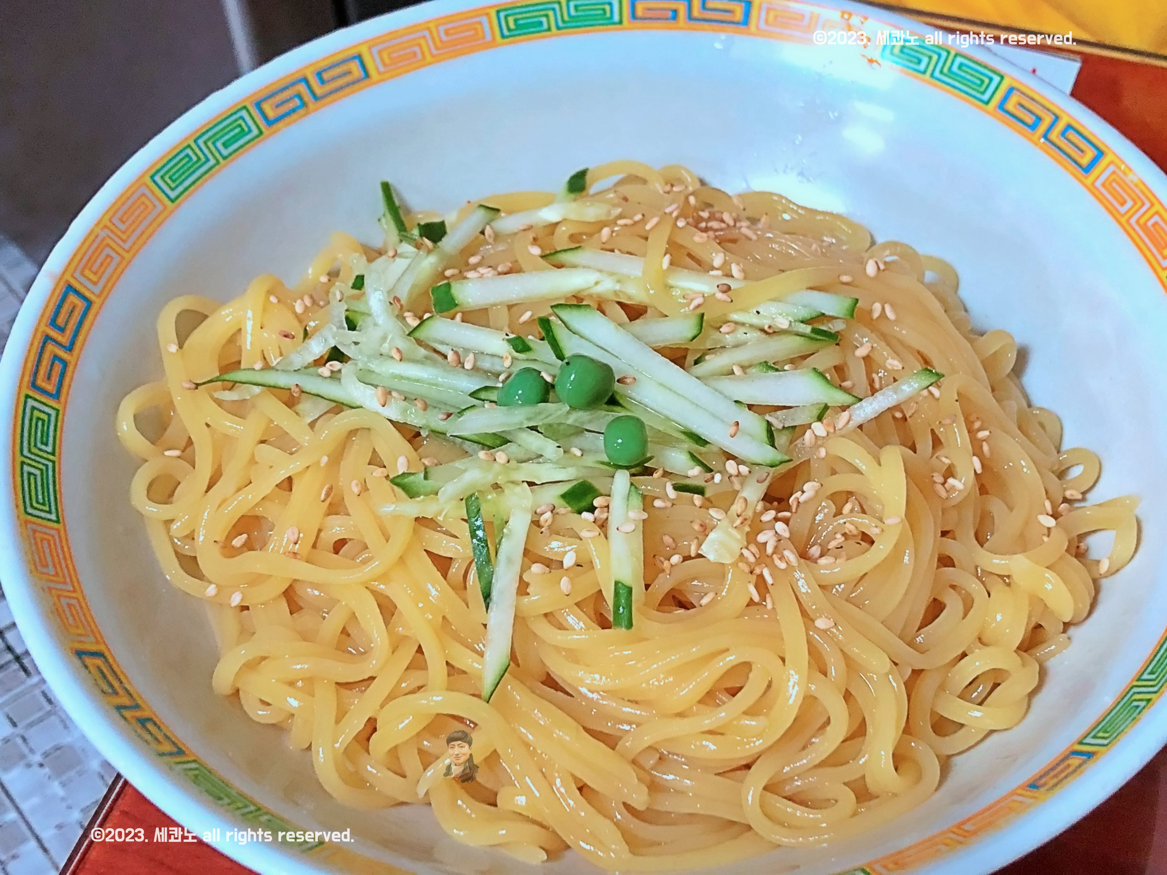 녹색의 오이와 완두콩이 고명으로 올라갔고