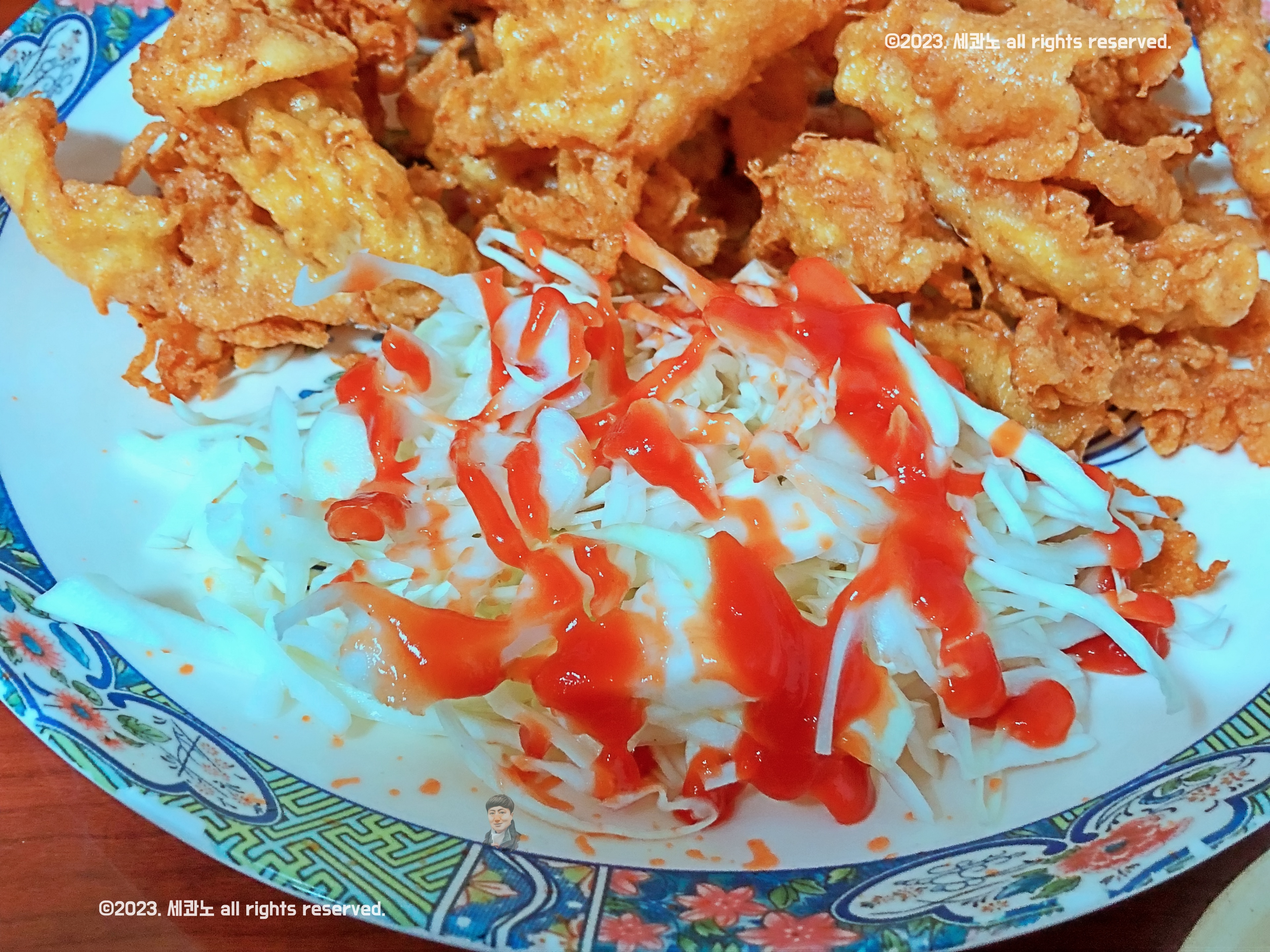 일단 채썬 양배추가 케찹과 같이 나온 게..