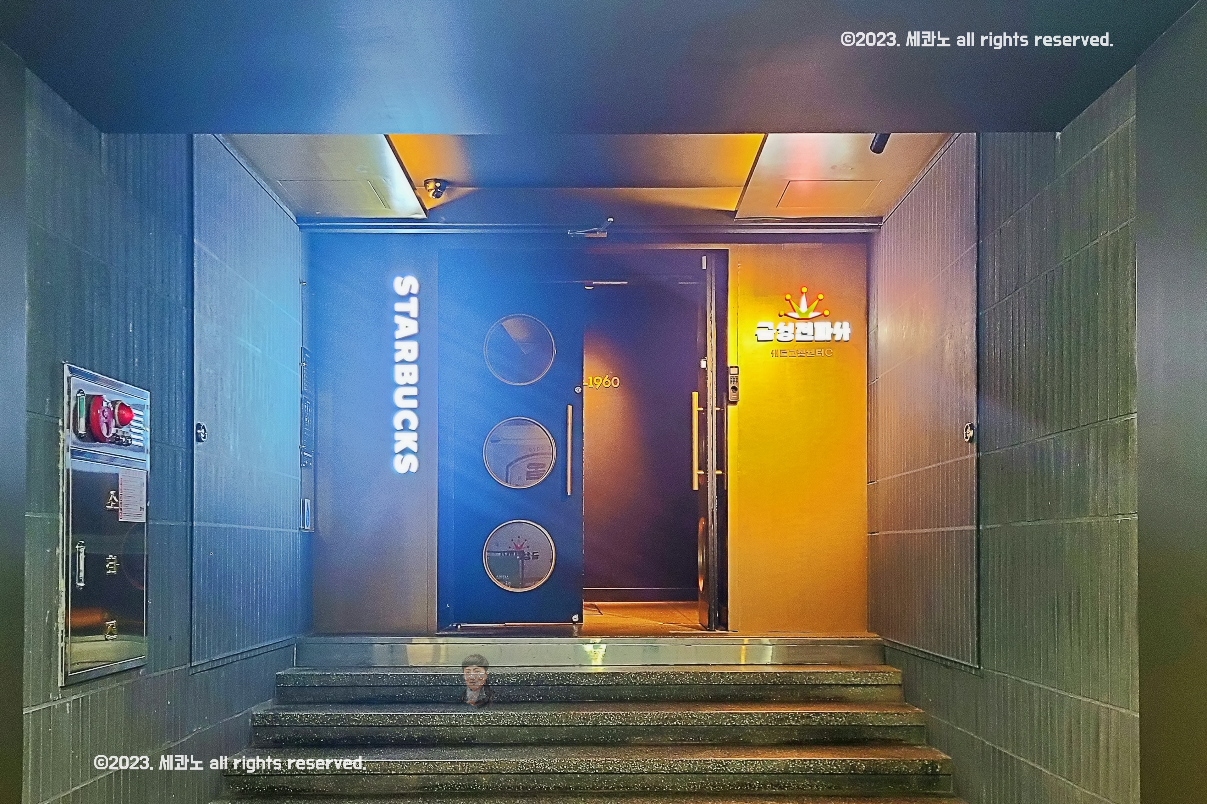 계단 위쪽으로 스타벅스 마크 그려진 것을 보고