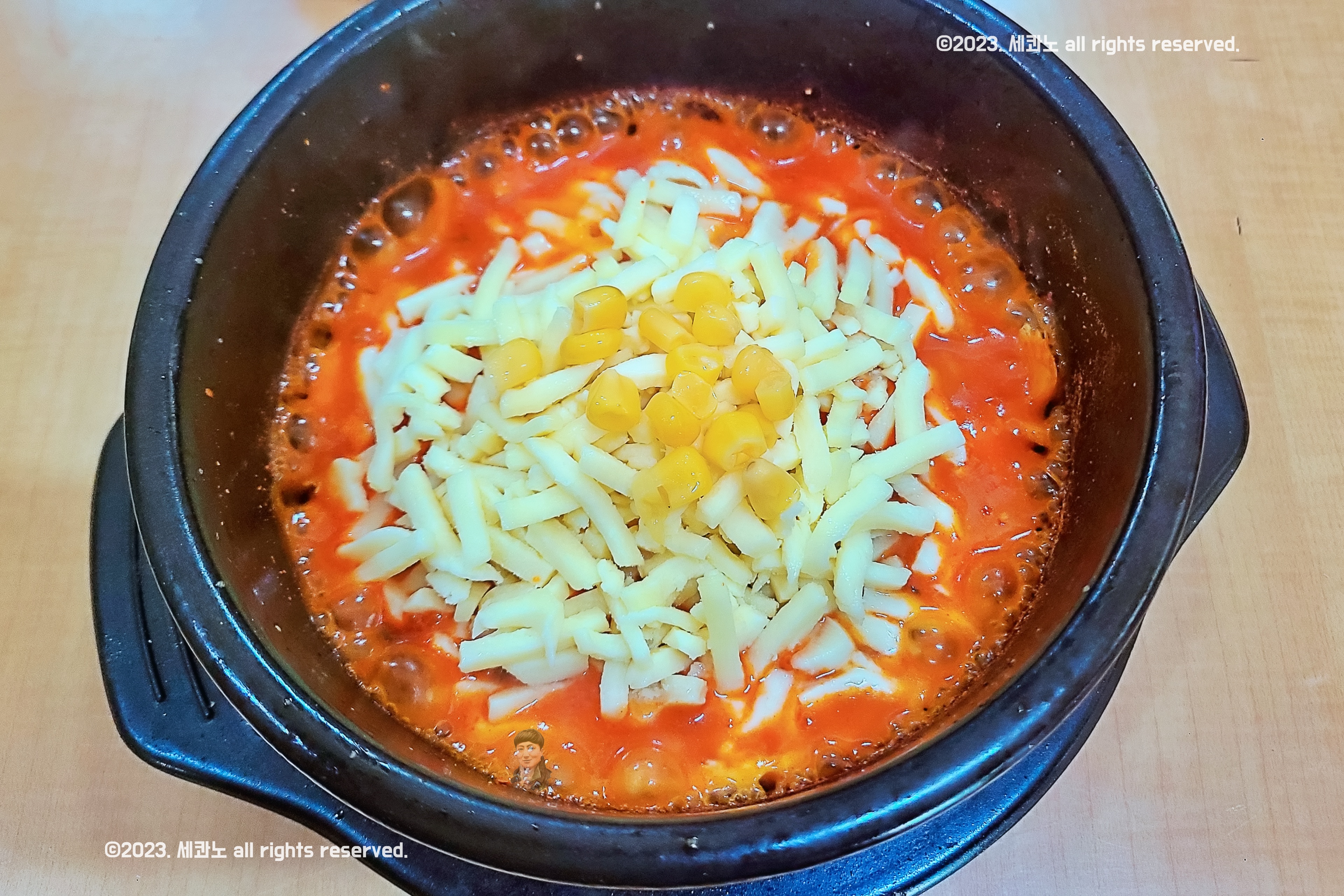 떡볶이 위에 모짜렐라치즈를 뿌려내더라.