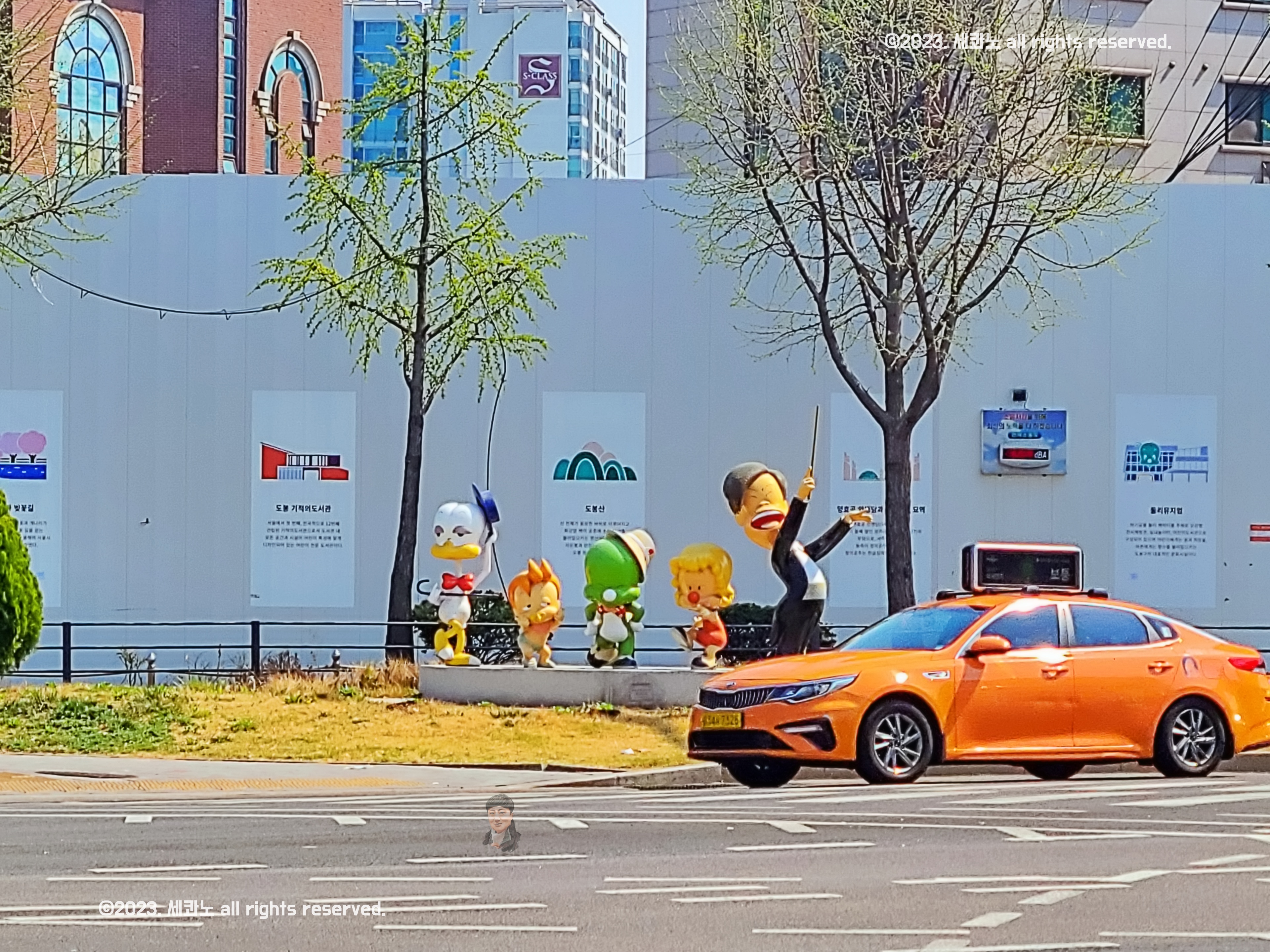 정의여중사거리에 둘리 가족 동상이 보인다.
