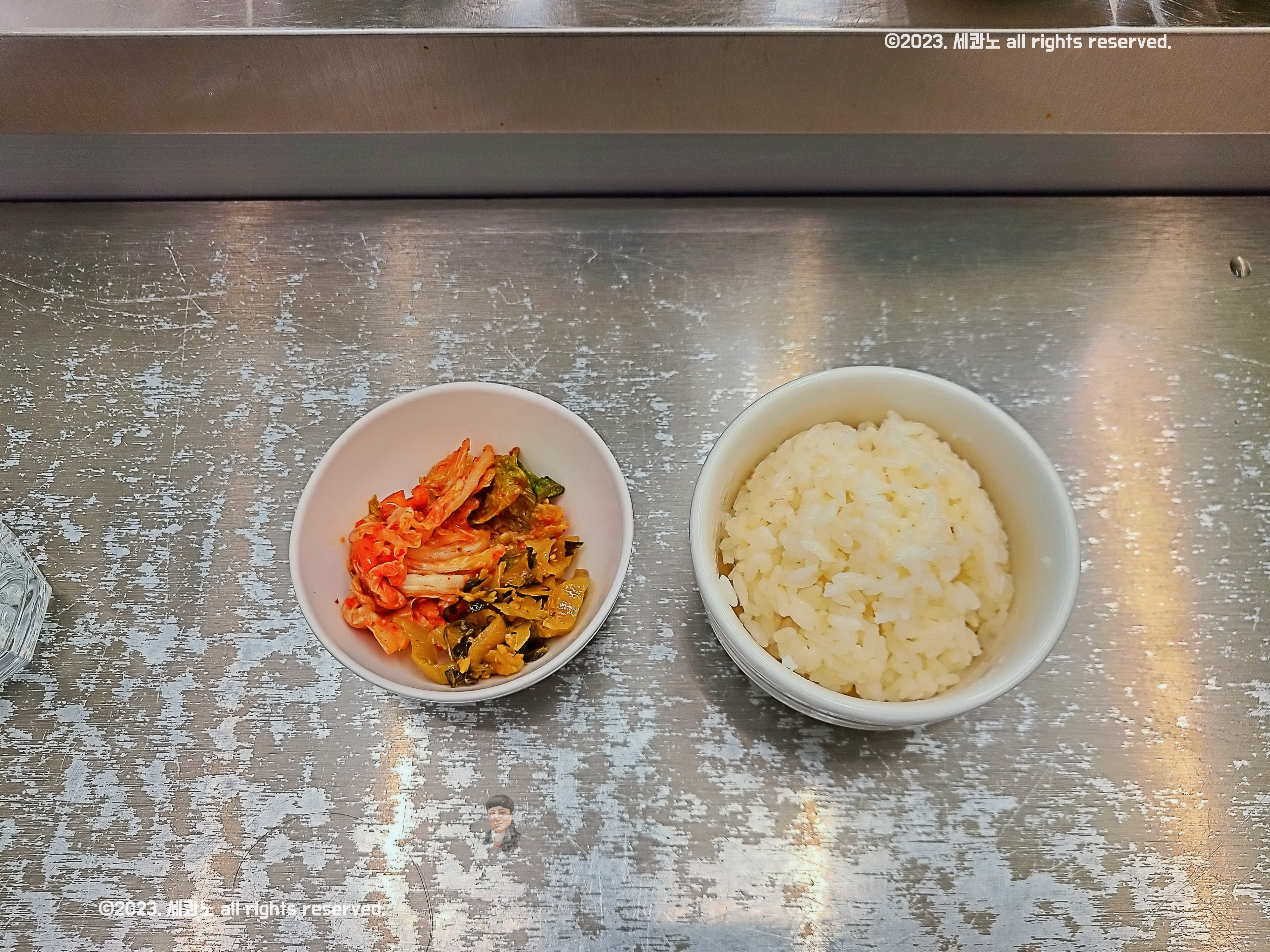 놓여진 반찬(배추김치, 갓 반찬)을 곁들여 먹으면